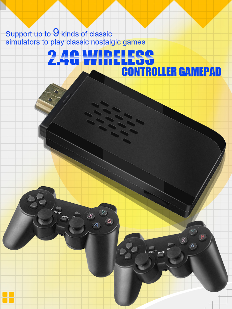 1 x Game Stick Console1 x Wireless receiver2 x Controller 1 x Charge cable1 x User manual1 x HD cableTF card (option)