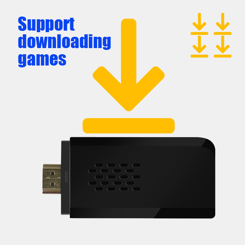 With upgraded GB2 CPU chip, the game stick 4K TV games console is built-in more than 9 Emulators, compatible for MAME, PS1, GB, GBA, GBC, MD, SFC, FC and ATARI format games, which you can download and save at its Memory Card;