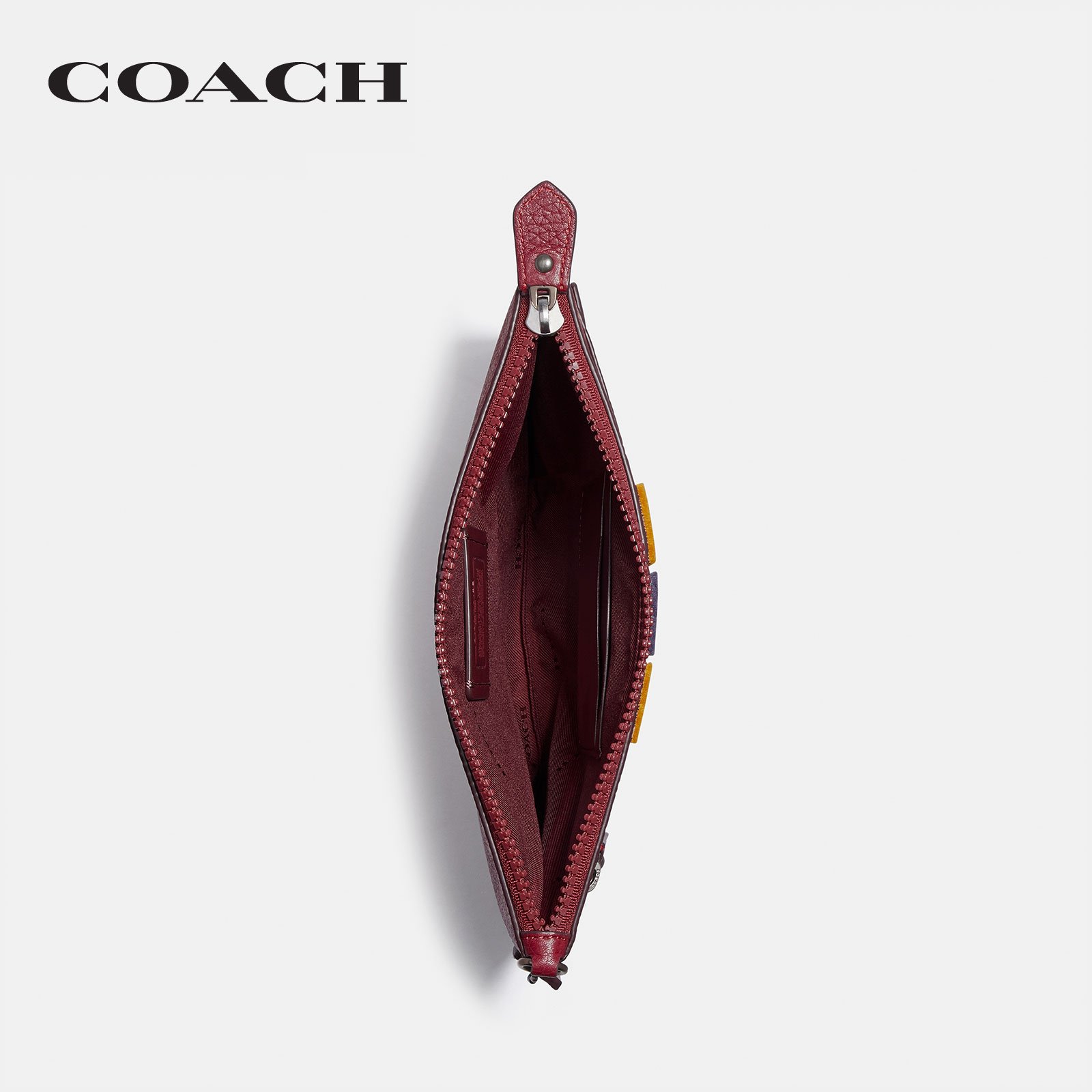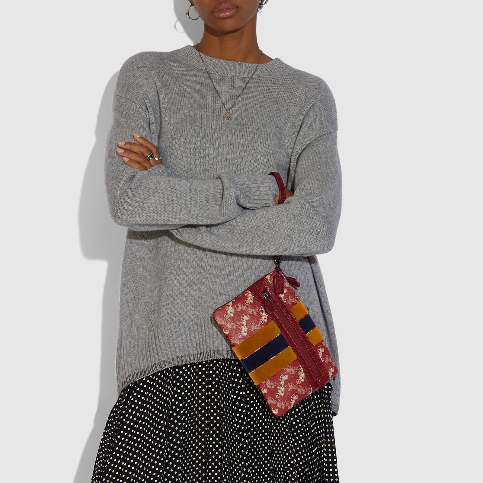 COACH WOMENS LARGE FRONT ZIP WRISTLET WITH HORSE AND CARRIAGE PRINT AND VARSITY STRIPE