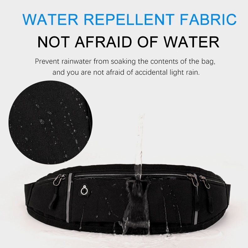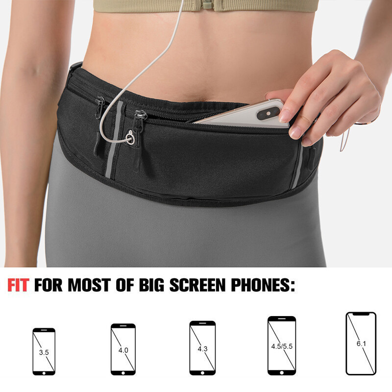 The waist bag with 3-pocket design. The main pocket can easily hold a 6.5-inch phone, and the two side pockets can hold keys, change, etc.