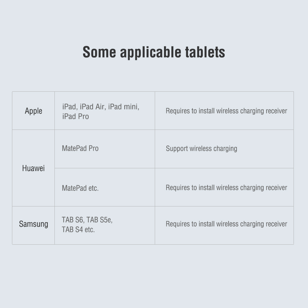 Flexible adjustment, accurrate alighnmentThe wireless charger needs to be aligned with the center of the tablet (Receiver coil)Compatible with tablets of different sizesCharge horizontally or verticallyTablets without wireless charging function need to be equipped with wireless charger receiver to start wireless charging15W (Max) fast wireless charging / Almost same speed of charging as using the original adapterMulti-angle adjustment - Relieve shoulder and neck pressureMulti purpose - Detachable design, stand and wireless charger can be use separatelyStable design - reinforced hinge to hold your device firmlyFolding and space saving designConveninet for storageAnodized aluminum alloy - CNC trimming , fine texture, rounded edgesNon slip design to protect your tablet in all round wayNon slip surface, non slip groove, non slip base