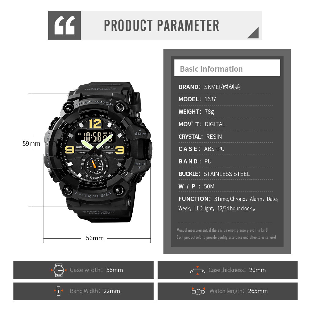 SKMEI Men Sport Digital Watch Dual Display Alarm Watch Waterproof Wristwatches Jam tangan lelaki For Man Men 1637