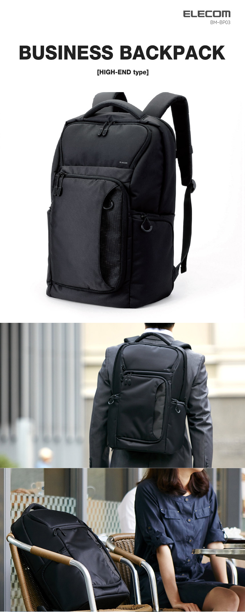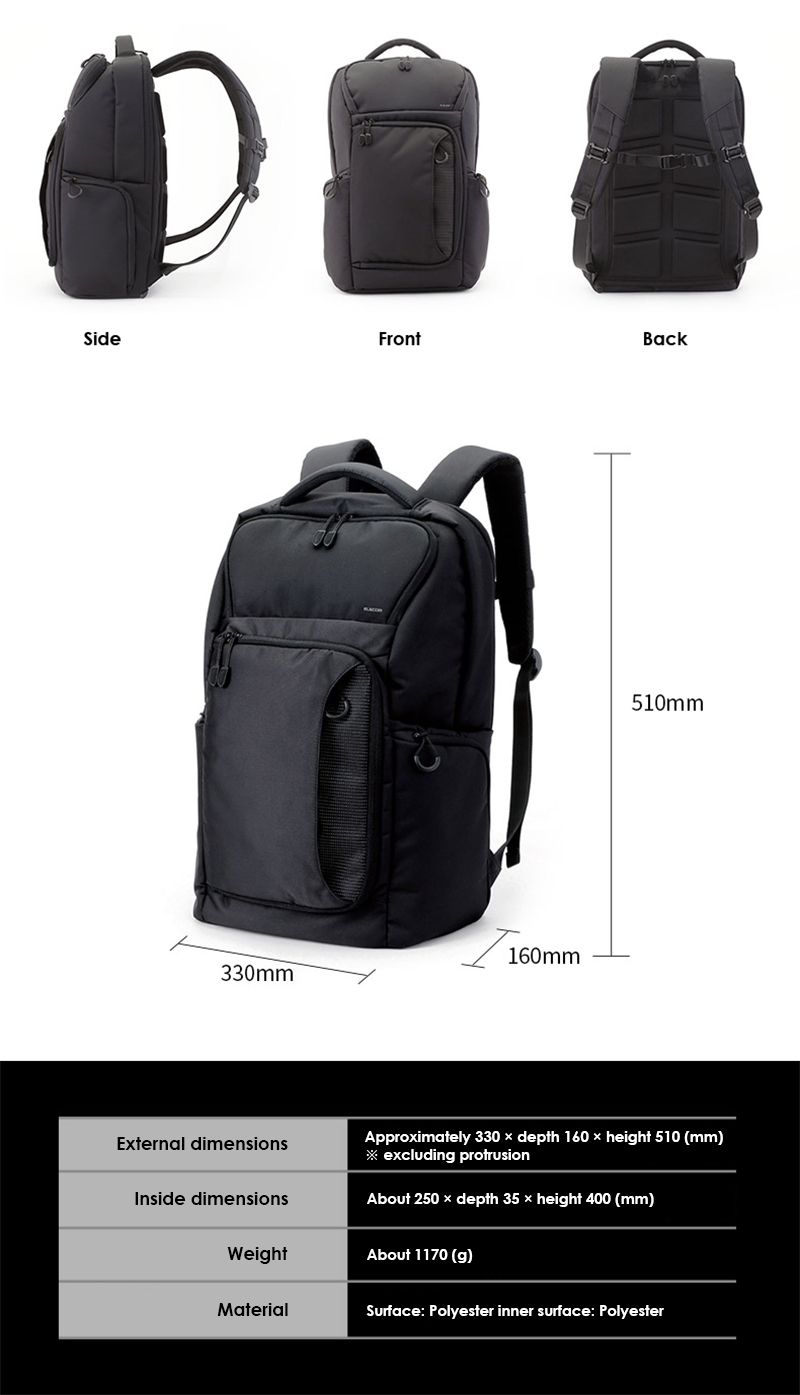 ELECOM 'BP03' High-grade Quality / Large Capacity Backpack/ 16.4inch Laptop Backpack / Travel/ Business Backpack/ Leisure/ Built-in Rain Cover/ 3-Air Chamber/ Black Color