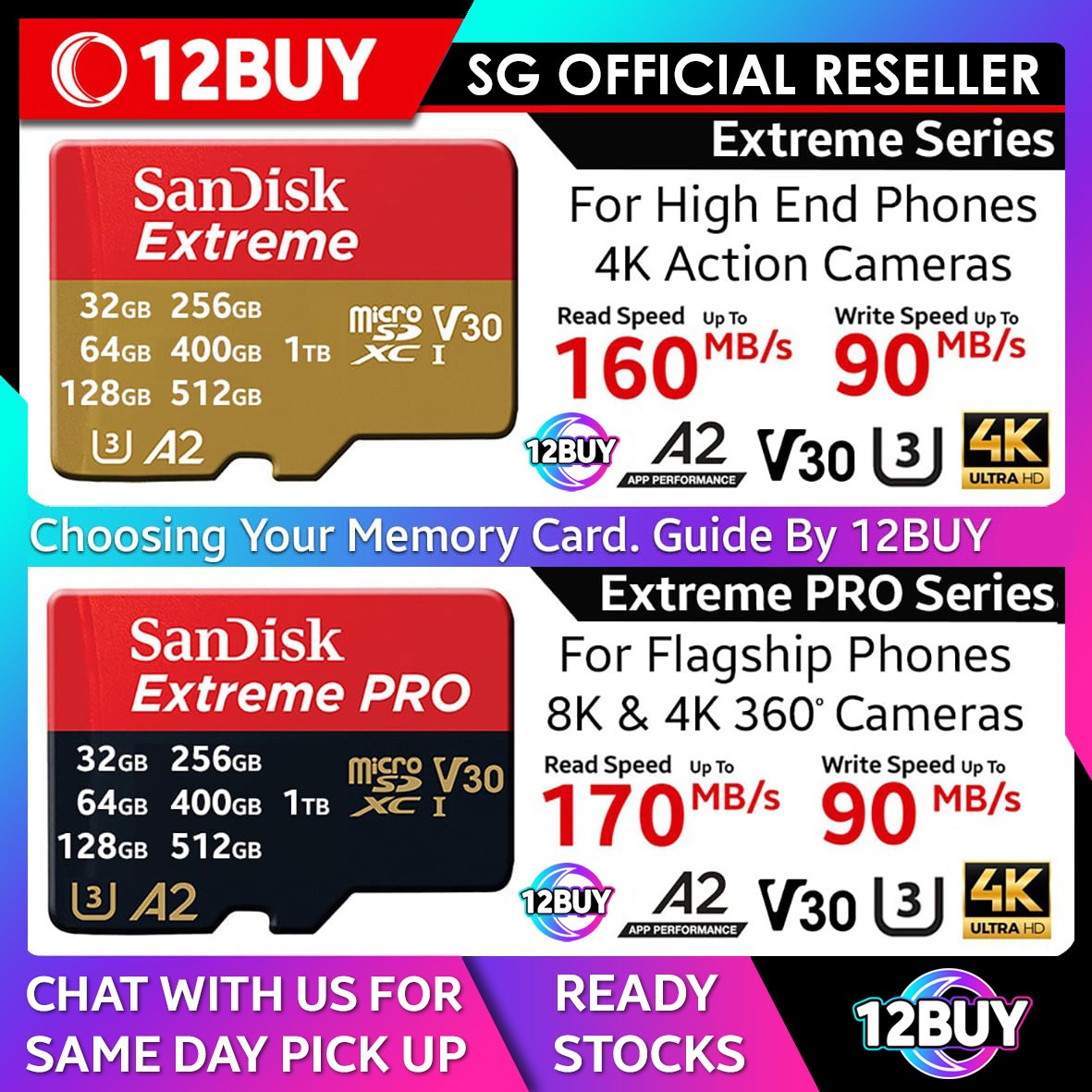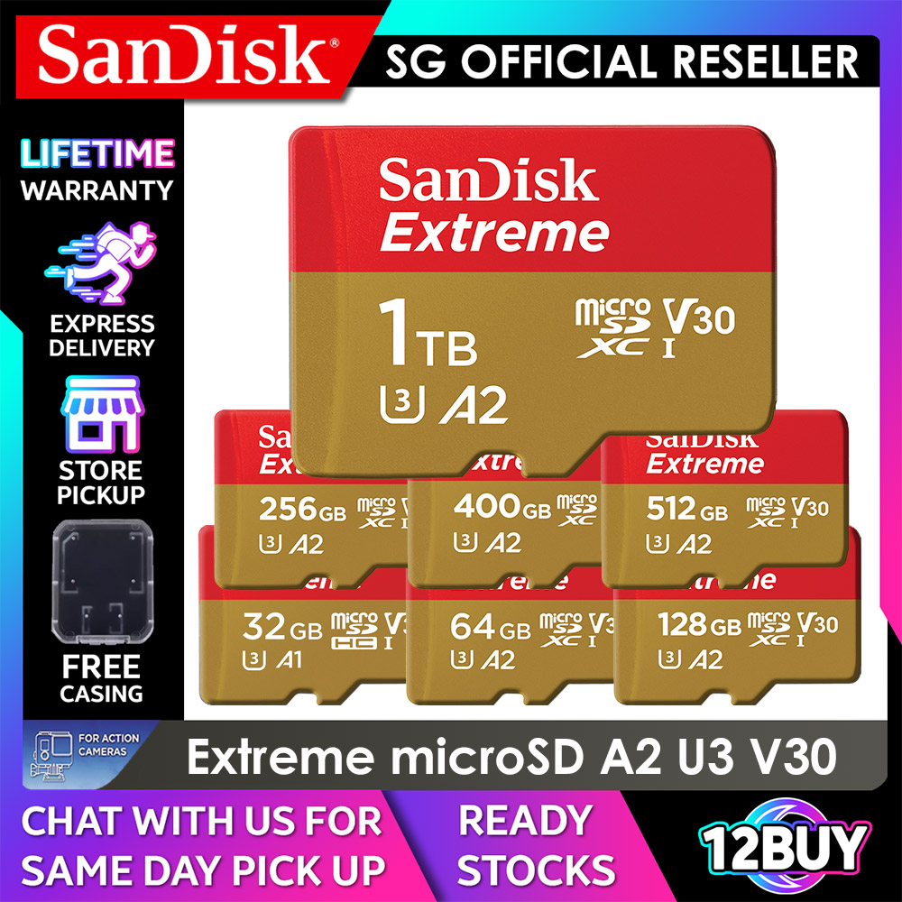 SanDisk Extreme microSD Card Full 4K V30 U3 UHS-I C10 32GB 100mb/s 64GB 170MB/s 128GB 256GB 400GB 512GB 1TB 190MB/s 160mb/s QXAF QXAH QXAA QXAV 12BUY.MEMORY