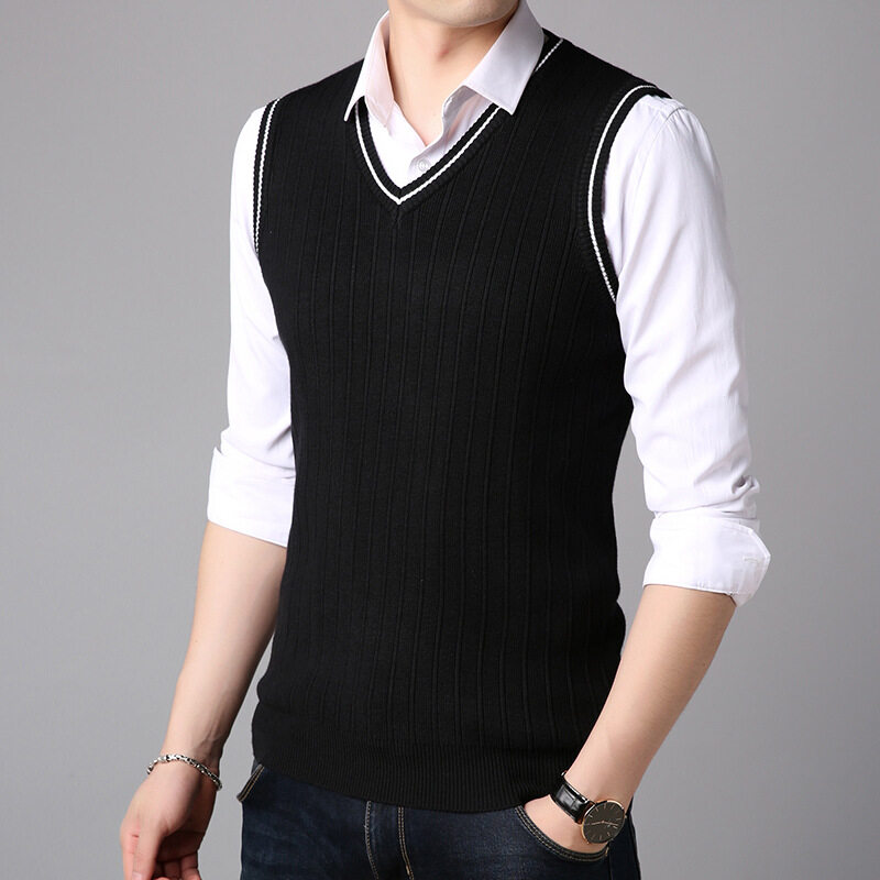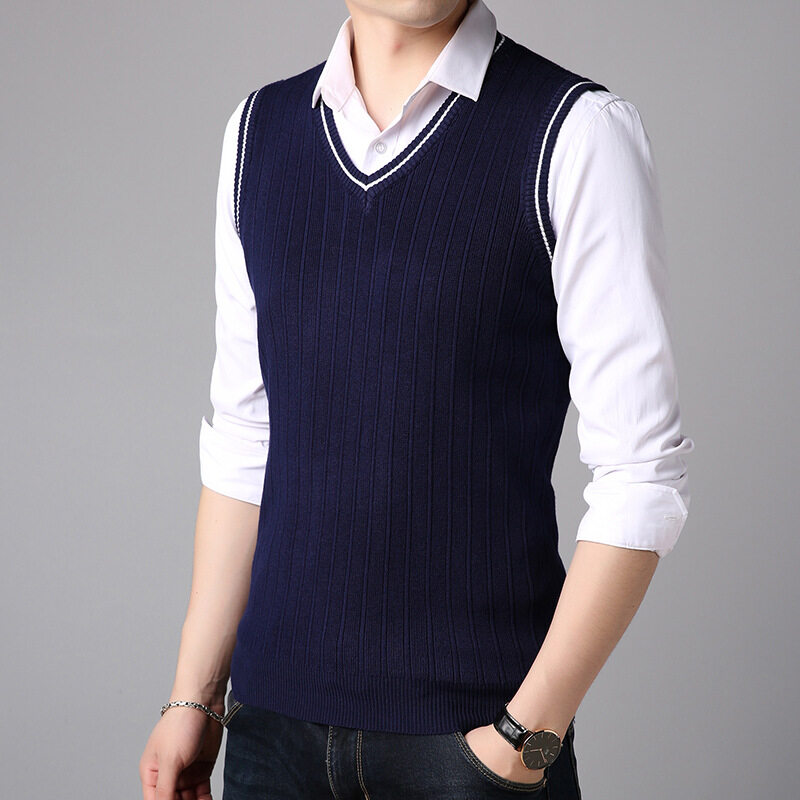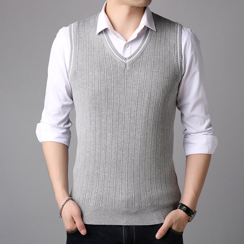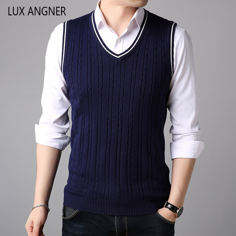 LUX ANGNER Autumn New Men V Neck Sweaters Men Sleeveless Stripe Vest Pullover Sweater Men Korean Slim Casual Sweater Clothes