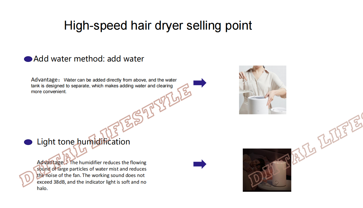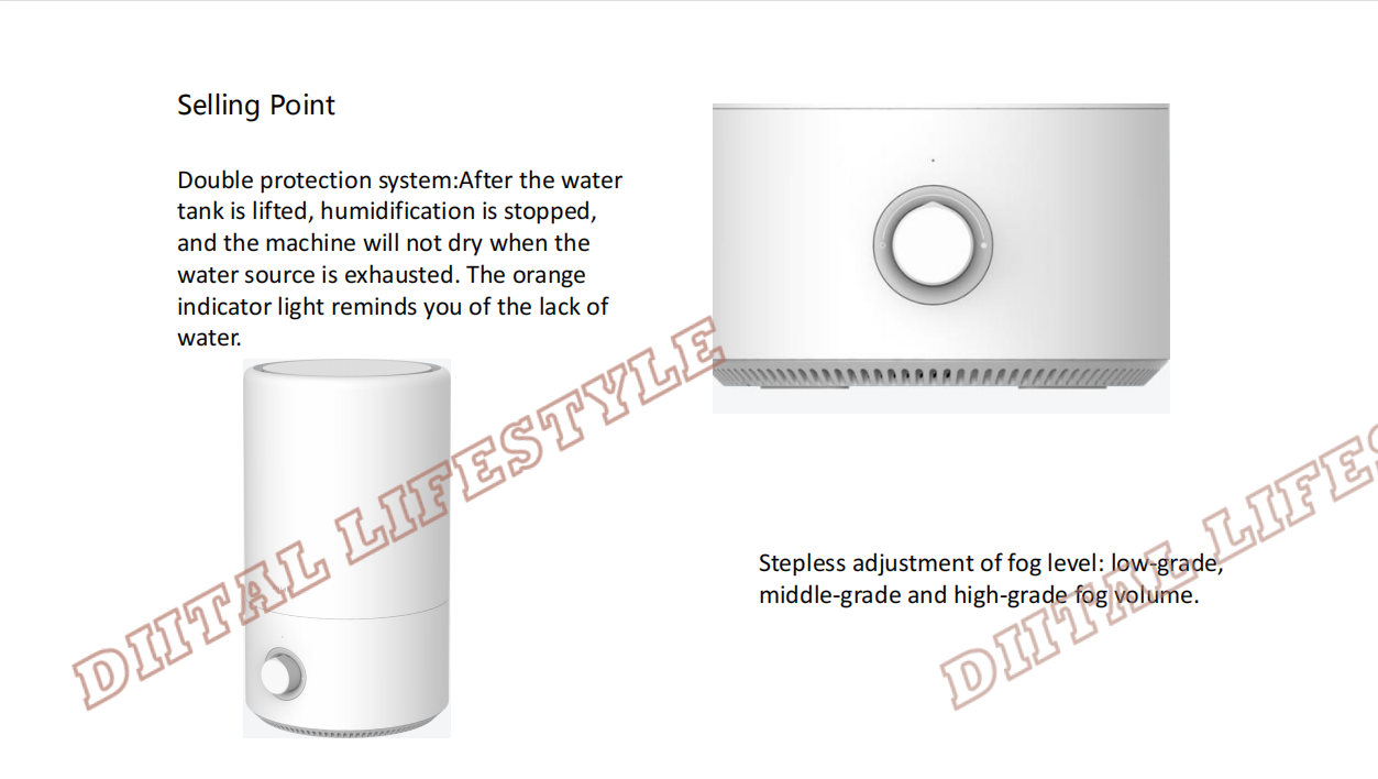 Main Features:Add water from above, easierSay goodbye to the traditional way of adding water from below, Mijia humidifier can add water directly from above. The separate design of the water tank makes adding water and cleaning more convenient.Sufficient amount of heavy fog, moisturizing all dayThe 4L large-capacity water tank is equivalent to 16 bottles of 250mL mineral water. 280mL/h strong fog volume, 10 square meters bedroom can humidify at least 9% in one hour, and relieve dryness faster. The longest humidification time can be up to 36 hours, and there is no need to add water frequently.Silver ion antibacterial material, humidification water source does not polluteThe main components of the water tank and the wading base use silver ion materials, which can effectively inhibit the growth of E. coli and Staphylococcus aureus, and the antibacterial rate can reach 99%.Light tone humidification, moisturizing does not disturbThe Mijia humidifier reduces the sound of large particles of water mist flowing and reduces fan noise, and the working sound does not exceed 38dB. The indicator light is soft and without halo, and it is not dazzling in the dark. Low noise, good sleep, comfortable sleep and moisturizing all night.Refuse to wet the table, the humidity is only in the airThe high-frequency ultrasonic atomizer vibrates 1.7 million times per second at high speed to break up water particles. The built-in baffle blocks the large particles of water, leaving only the fine water mist directly into the air through the oblique straight air duct, and the water mist is ≥50cm from the table.Large diameter designThe upper mouth of the Mijia humidifier has a diameter of 14cm, and the open mouth is easy to scrub. The sleek and delicate internal structure reduces the dead spots that hide dirt. The water tank is light and easy to lift, making cleaning more labor-saving.Double protection systemAfter the water tank is lifted, humidification is stopped. When the water source is exhausted, the machine does not dry and the orange indicator light reminds the lack of water. Double protection makes humidification safer.Stepless adjustment of the amount of fog, choose as you likeLow fog volume | Middle fog volume | High fog volumeSmall, it can be placed anywhereSmall space water storage boxReduce water storage, reduce bacteria breeding environment, humidify safe and cleanWaterproof membrane grooveBalance the air pressure of the water tank to prevent the machine from stopping workingUltrasonic welding technologyImprove product tightness and reduce the possibility of bacterial survivalSemi-closed air inlet gridReduce the possibility of internal moisture and extend product lifeNote:CN power charger charging, delivery needs to match the corresponding country adapterParameters:Rated voltage: 220V, 50HzRated power: 17.5WNoise: ≤38dBCaliber: 14cm