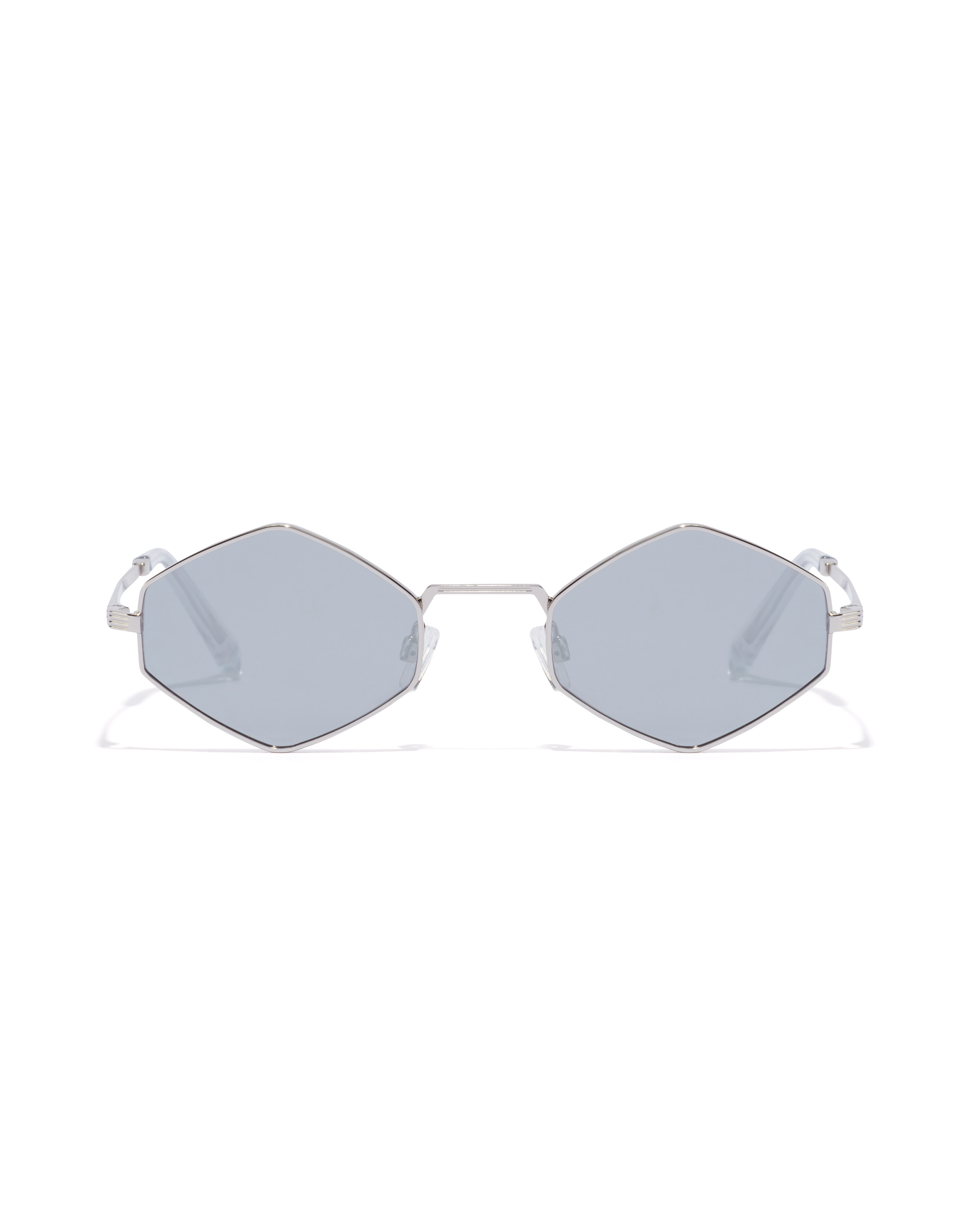 A retro-influenced, slim hexagonal design combining polished silver-tone stainless steel frame, transparent earpieces and mirrored chrome lenses. The urban raves of the 90s are revisited for the 20s.
