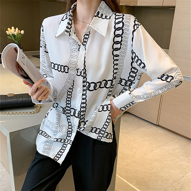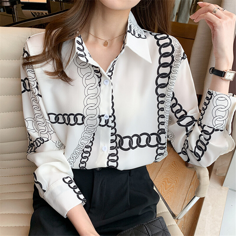 Loose Shirt Women Long Sleeve Fashion Blouse Printed Chiffon Polo Collar Korean Top Lady Clothes