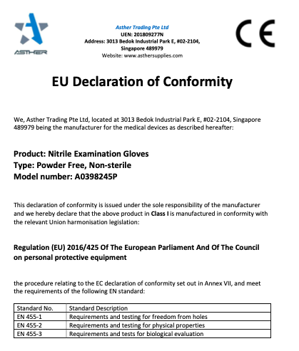 Asther Trading Private Limited. is a new manufacturer of latex and nitrile examination gloves for both general applications and medical markets. The core value for our brand is: ”Quality and Safety Assured” We are committed in providing our customers with good quality products, high standard service and trustworthy business relationship.
