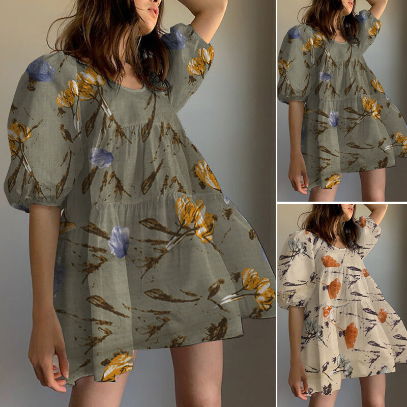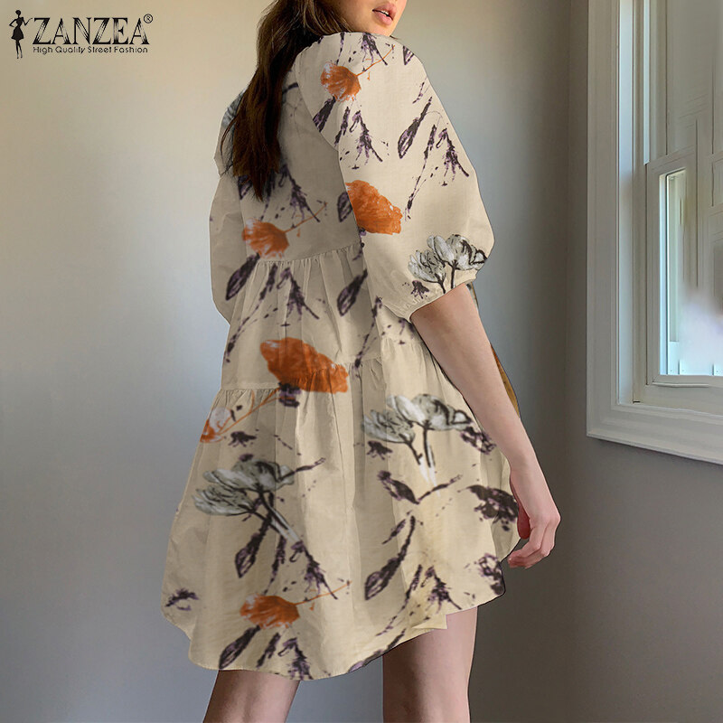 ZANZEA Women Floral Puff Sleeve Sundress Vintage Retro Print Bohemian Mini Dress