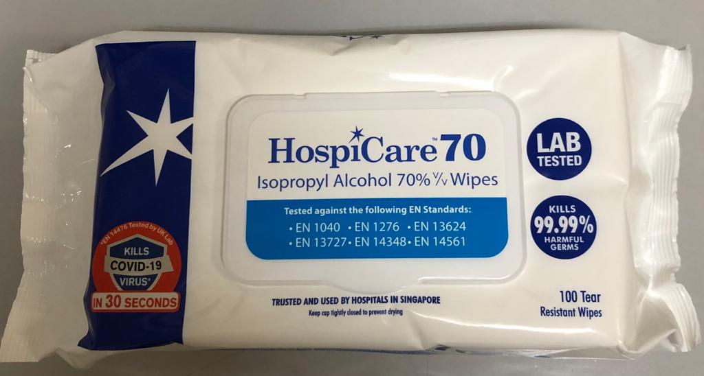 HospiCare 70 are disposable, non-woven wipes saturated with 70% Isopropyl Alcohol solution. Isopropyl Alcohol is an excellent disinfectant that is commonly available and inexpensive. Convenient to use for both cleaning and disinfecting as it is in wipes form.