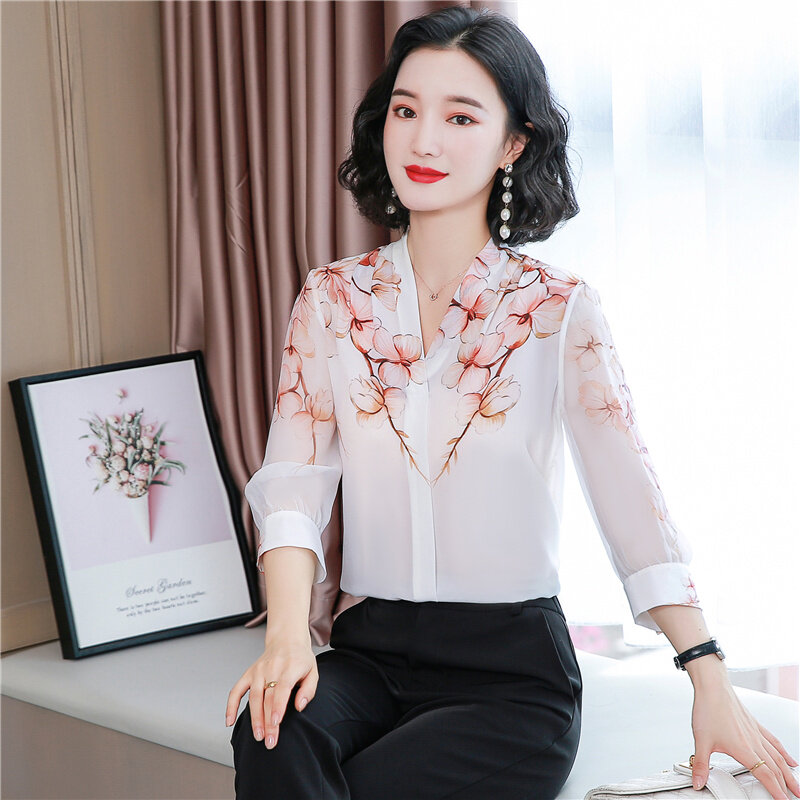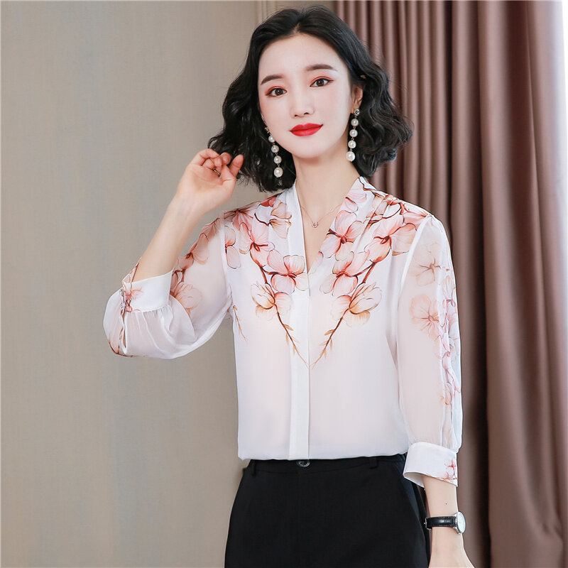 AFEG Korean style women's 3/4 sleeves V-neck printed temperament blouse for women