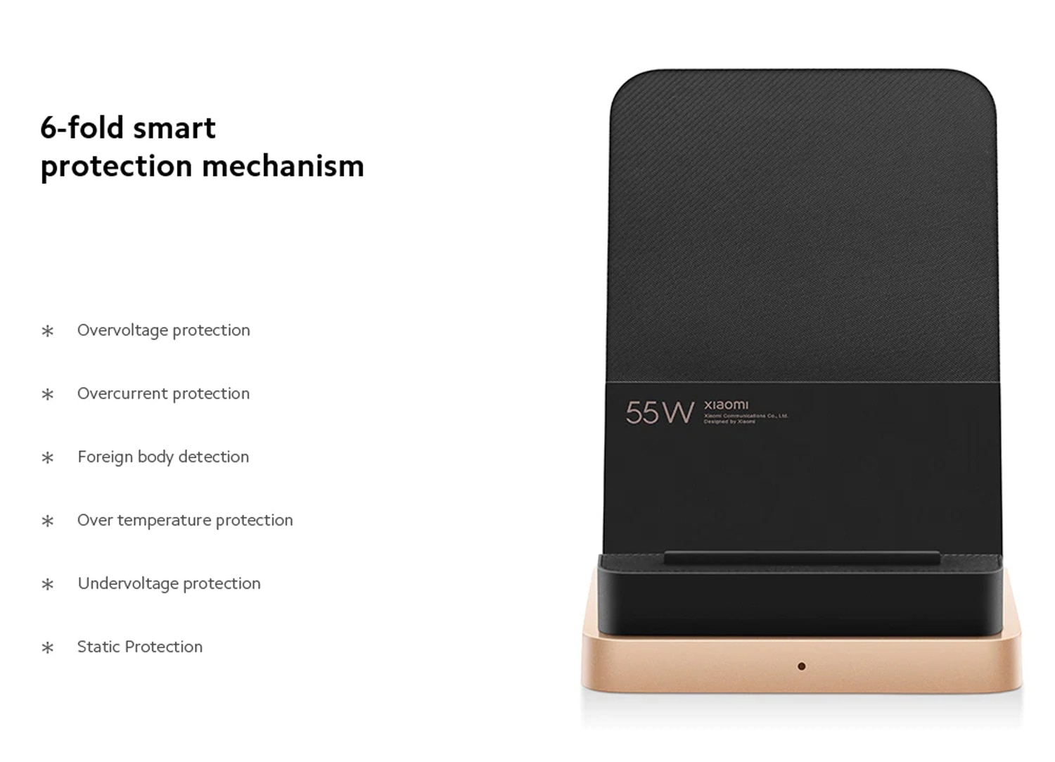 Charge as soon as it is discharged, 100% charge in 40 minutes Wirelessly charge the Mi 10 "Extreme Commemorative Edition", charging to 100% in 40 minutes at the fastest, realizing a full day of battery life. Ideal tilt angle The overall appearance is simple and compact, and ergonomic, you can process information while charging, and the viewing angle is excellent. Built-in silent cooling fan Built-in silent fan + new air duct design, active heat dissipation, to ensure that the phone does not heat up at low temperatures throughout the process 6-fold smart protection mechanism Overvoltage protection Overcurrent protection Over-temperature protection Undervoltage protection Foreign body detection Static Protection