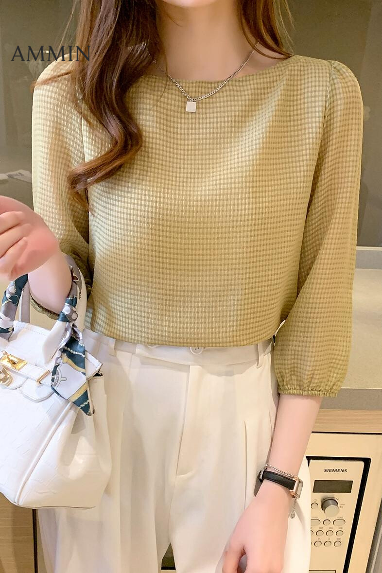 AMMIN 2021 New Summer Three-quarter Sleeve Fashion Loose Chiffon Top For Lady One-word Neck Loose Lantern Sleeves Plaid Chiffon Top Casual Blouse