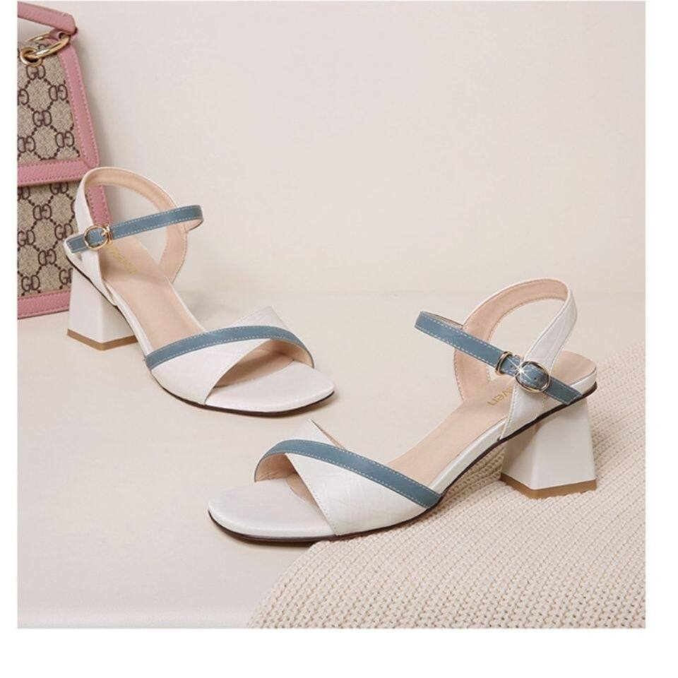 Da Xiaoni 2021 new sandals mid heel high heels women's one word sandals with chunky heels fashion casual shoes women's shoes