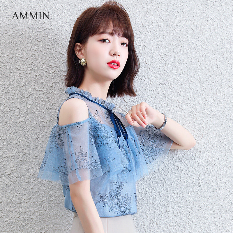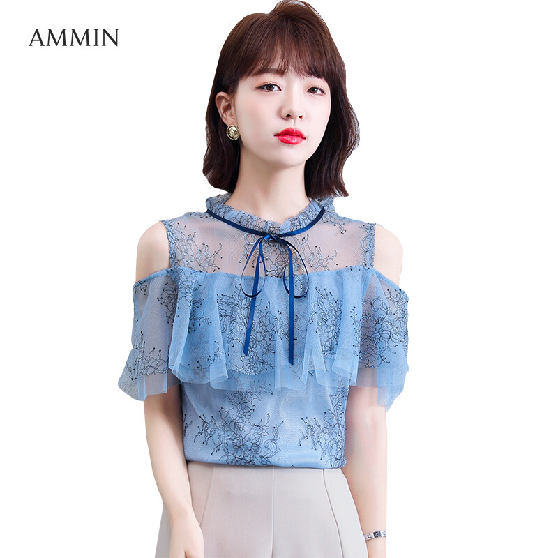 AMMIN Tops 2021 summer Korean version of the new pleated wood ear stitching round neck bow tie off shoulder ruffled stitching chiffon shirt women's elegant and sweet short-sleeved hollow mesh stit