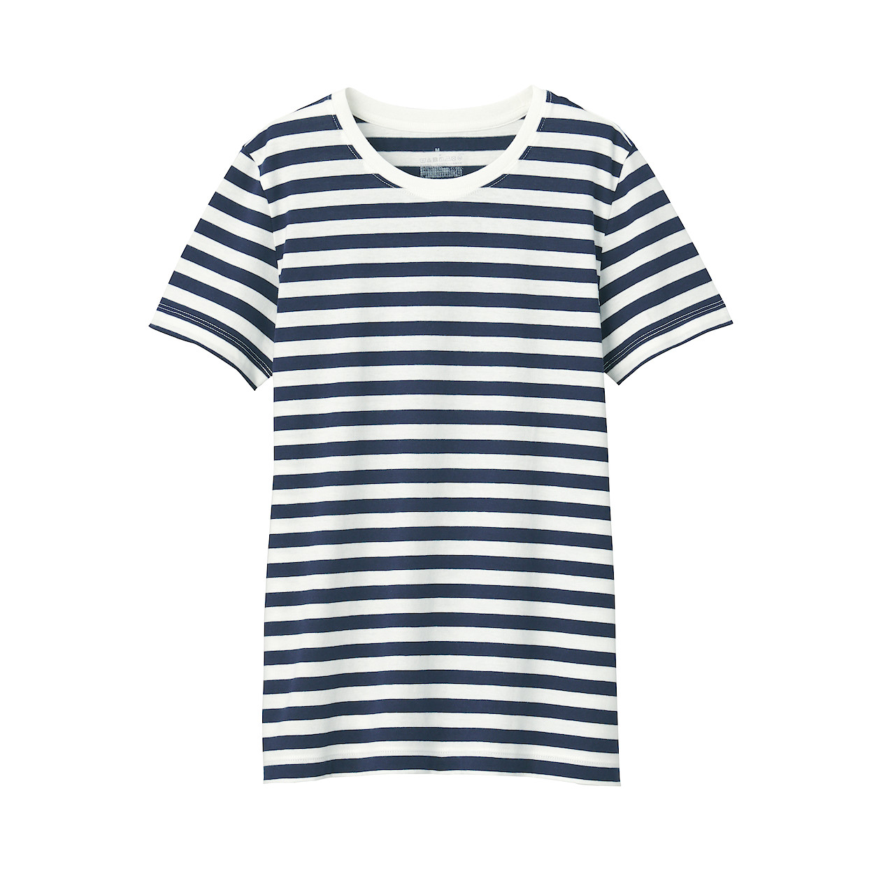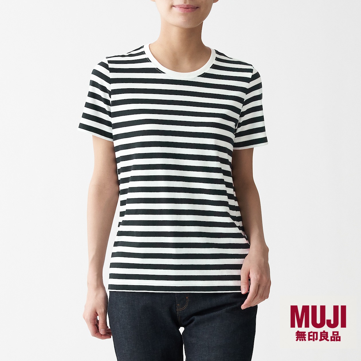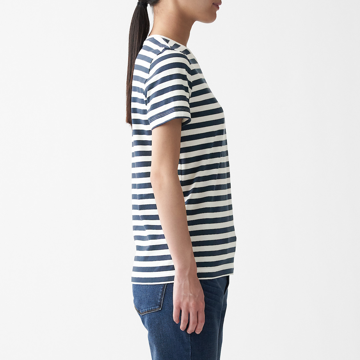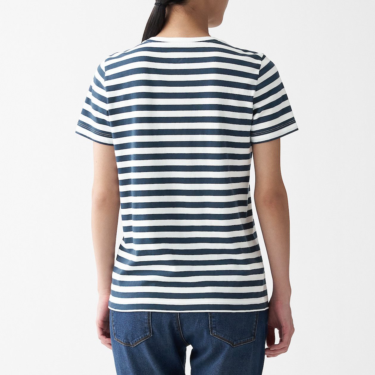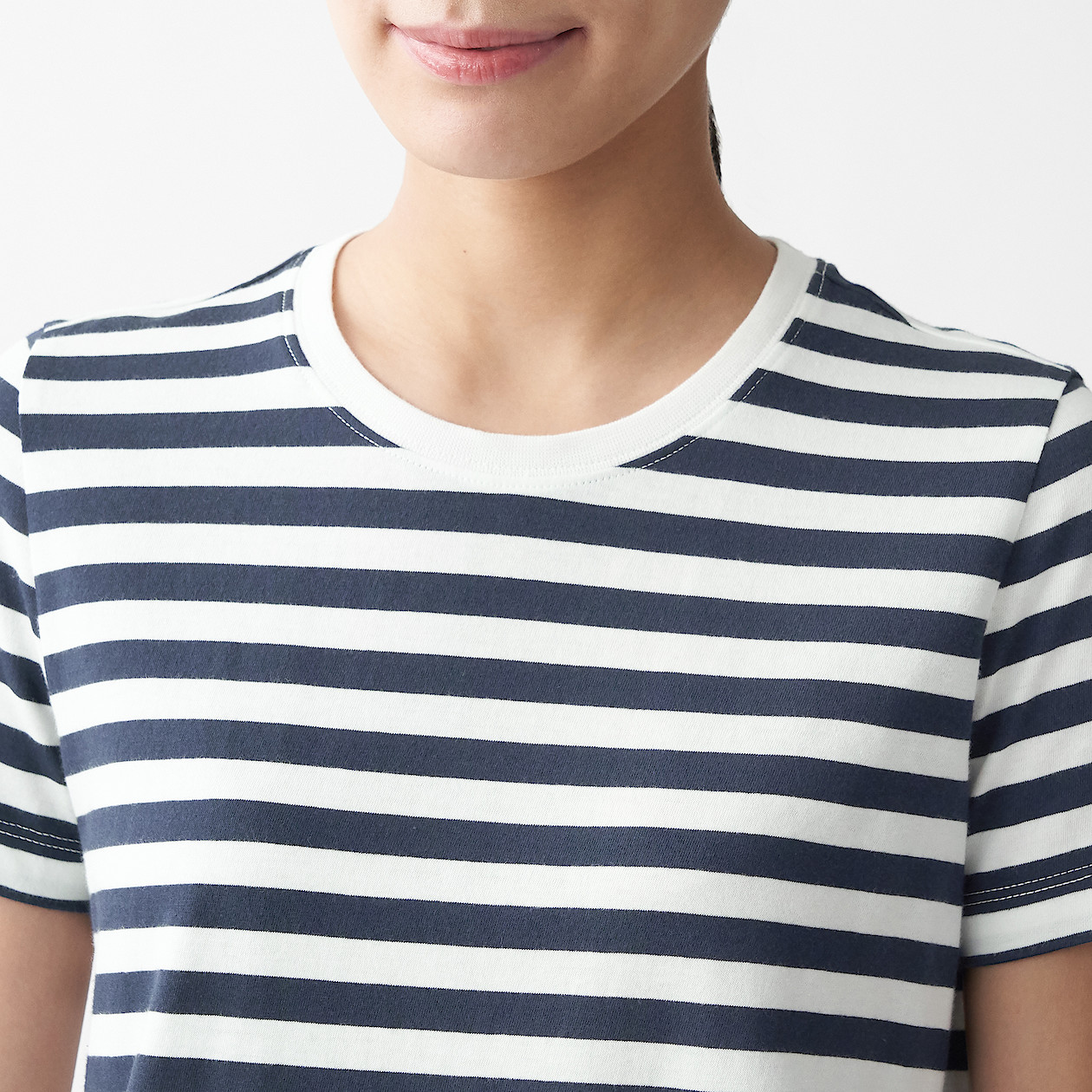 MUJI Ladies Indian Cotton Jersey Stitch Border Crew Neck Short Sleeve T-Shirt