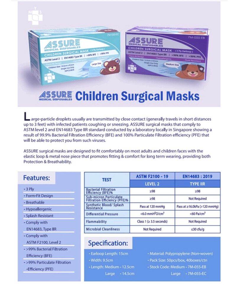 [Bundle of 3] ASSURE Surgical Mask Kids Children 50’s/box 3-ply Earloop Disposable 99% BFE Medical Grade Toddler Size (2-5 years old)