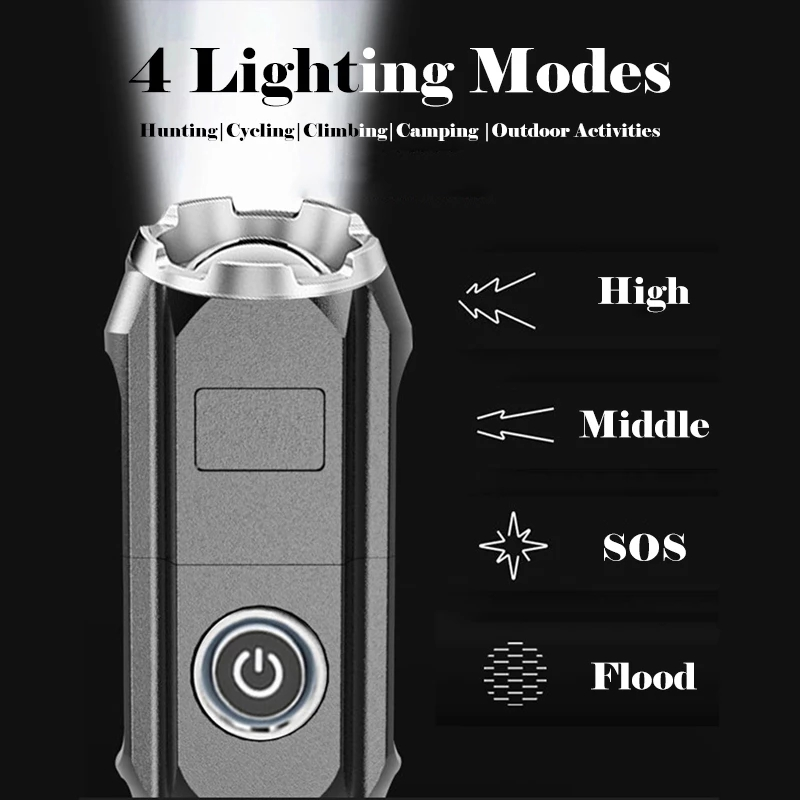 Basic ParametersMaterial: ABS plastic material Battery: Built-in rechargeable battery(Include) Waterproof: life waterproof Charging method: USB charging Weight: about 80g/100g COB Style 4modes:(strong light -low light -flash-COB) Switch: Push the switch Lamp beads: XPE Size: 13*3.5cm Endurance: 4-6H Battery capacity: 1200 mA Gear position: strong light-low light-strobe flash-side light flood light Focusing: telescopic focusing Features: telescopic zoom, battery indicator Package:1pc Flashlight+USB Cable