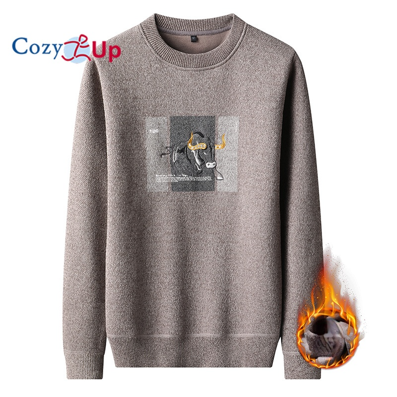 Cozy Up Long Sleeve Men Sweater Fashion Round Neck Embroidery Plus Velvet Thick Slim Knit