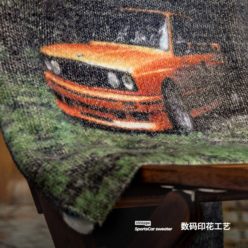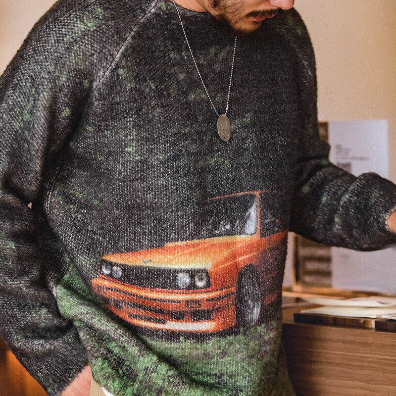 Maden brand Workwear style men hip-hop American 1980S retro sports car print crew neck sweater thick draped knit men academic sweater