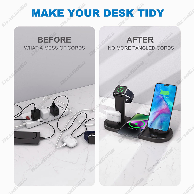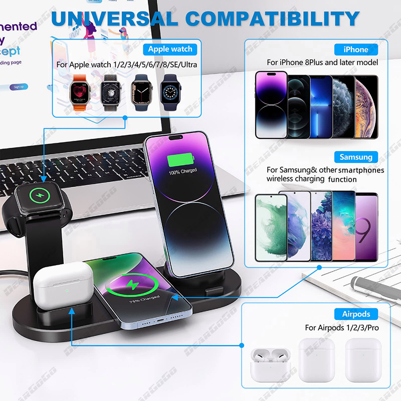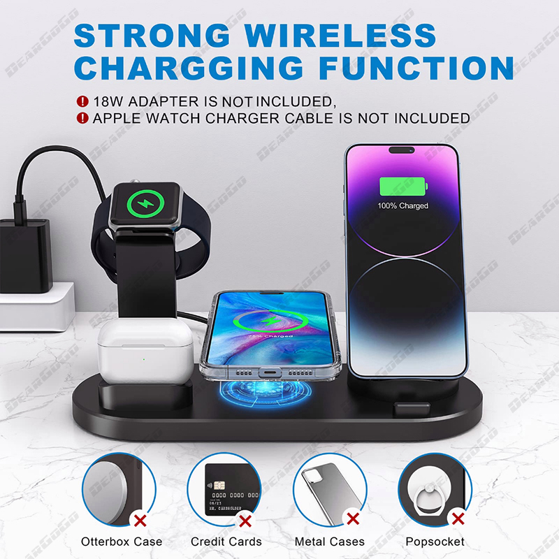 The Smart charging station combined qi fast wireless charger with 3 connectors base charger, iWatch ,Airpods charger and a USB outlet in one holder, support charging your apple watch, Airpods,iPhone/Samsung simultaneously. The 3 connectors base is rotary at 360°, Suitable for iPhone ,Android Type-c and Android Micro-usb cell phones