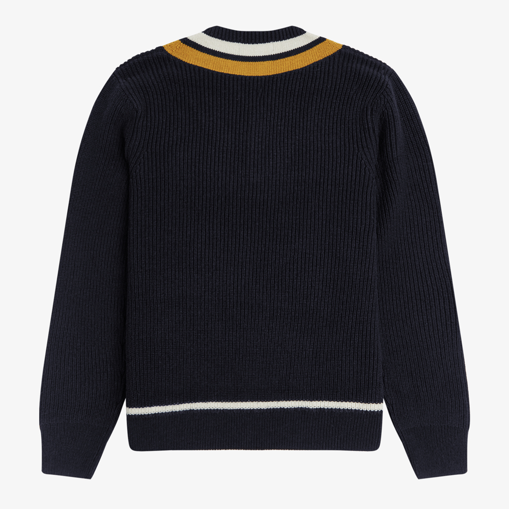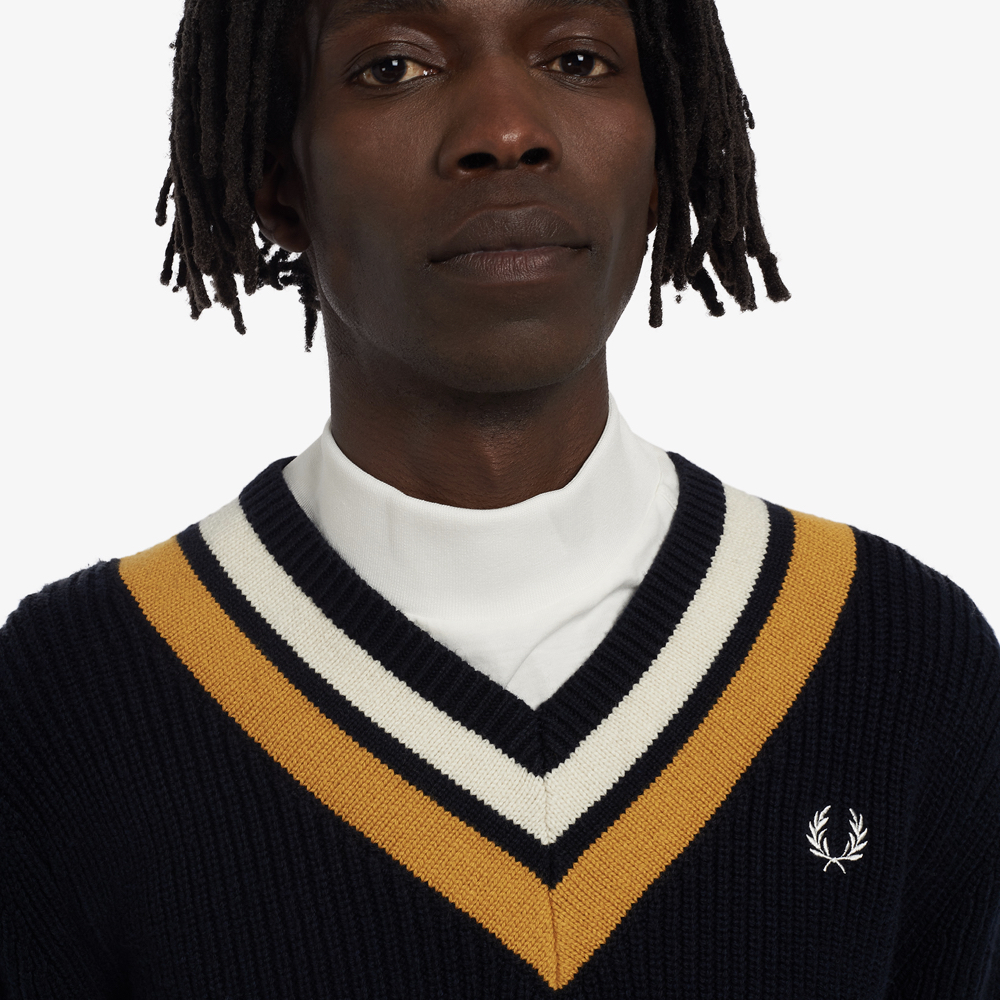 A V-neck tennis jumper knitted in a blend of wool and cotton. Designed with a relaxed fit and a contrast stripe design.