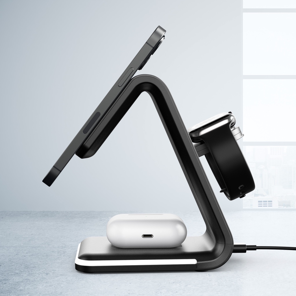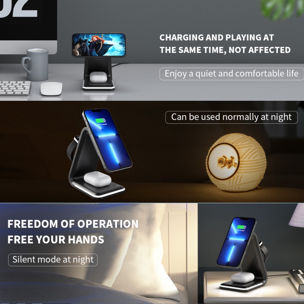 - 【4 IN 1 Magnetic WIRELESS CHARGER】 2022 new version wireless charger stand for fast charging your Qi-Enabled Phones, Apple Watch, AirPods wirelessly at the same time, no need to worry about the various charging cables in your life, making your desk tidy and cool! Brings you endless enjoyment and convenience! (High-Quality power adapter Qi 20W / (9V/2A) is needed for fast charging) -【TOUCH-CONTROL NIGHT LIGHT】This magnetic wireless charger comes with a soft LED night light featuring three brightness levels, creating a relaxing and comfortable atmosphere for parents to take care of their baby sleeping well at night. You just need simply tough the sensor button to turn on or off the night light. -【WIDE COMPATIBILITY】Support: ● iPhone 8 / 8Plus / iPhone X / XS / XR / X Max / iPhone 11 / pro / pro max/iPhone 12/12 pro/ 12 pro max/iPhone 13/13 pro/ 13 pro max ● Apple Watch Series 2/3/4/5/6/SE ●Airpods 2/Pro with wireless charging case●Galaxy Note10/Note10+/S10/S10+/Note9/S9/S9+/Note8/S8/S8+/S7/S7 Edge/S6 Edge and other qi enabled phones(charges directly through cases, Rubber/plastic/TPU cases less than 5mm thick only.Magnetic and metal attachments or cards will interfere with charging) -【Qi-certified AND NO WORRY CHARGING】The charger station uses the most advanced automatic control technology. Equipped with various functions, such as overcurrent, overcharge, overvoltage, overheat, etc. and temperature control function, automatic switch-off, foreign matter and metal object identification, etc. Flashes quickly to ensure your smartphone stable charging, so you can experience wireless charging with total peace of mind -【COMPACT DESIGN & OPTIONAL CHARGING ANGLE】Slip the 4 in 1 Wireless Charger into your laptop bag or backpack so you have it anywhere you need it; Qi-enabled Phones can be charged both vertically and horizontally, watching movies, listening to music, making calls or sending a message without interruption during the whole charging process - !! NOTE: Recommended use 18W and Above/QC 3.0 ADAPTOR TO ENJOY CHARGING EXPERIENCES. Product Specifications : - Certification: CE/FC/RoHS - Material: Fireproof Material + ABS - INPUT:9V2A 12V/2A - Wireless output: 15W(Max)/10W/7.5W/5W - Airport Output: 3W(Max) - iWatch Output: 2W(Max) - Night Lamp: 3 Brightnes Mode - 1.2 M Type C USB cable - Product size:114.5x82.5x142mm - Unite weight:252G - To enjoy a 15W Charging experience please do use a 20W QC Adaptor. What's in the package? - 1x 4-1 Wireless Charging Dock - 1x Type-C USB Cable 3 Months Local Warranty *Terms and conditions applied *