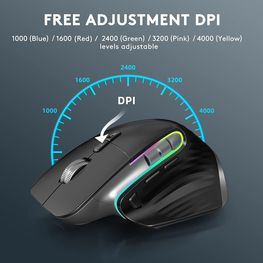 2) dual mode: the mouse support 2.4G wireless connection and bluetooth, it can work with the provided USB receiver, also it can connect via bluetooth, can connect up to 3 devices via 2.4G USB receiver and bluetooth. the DPI value is up to 4000. It is silent clicking.