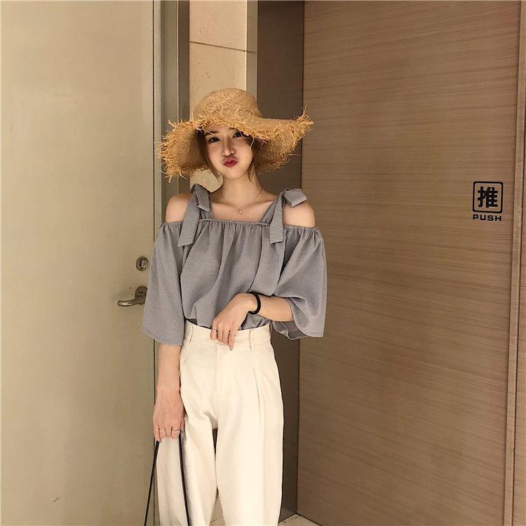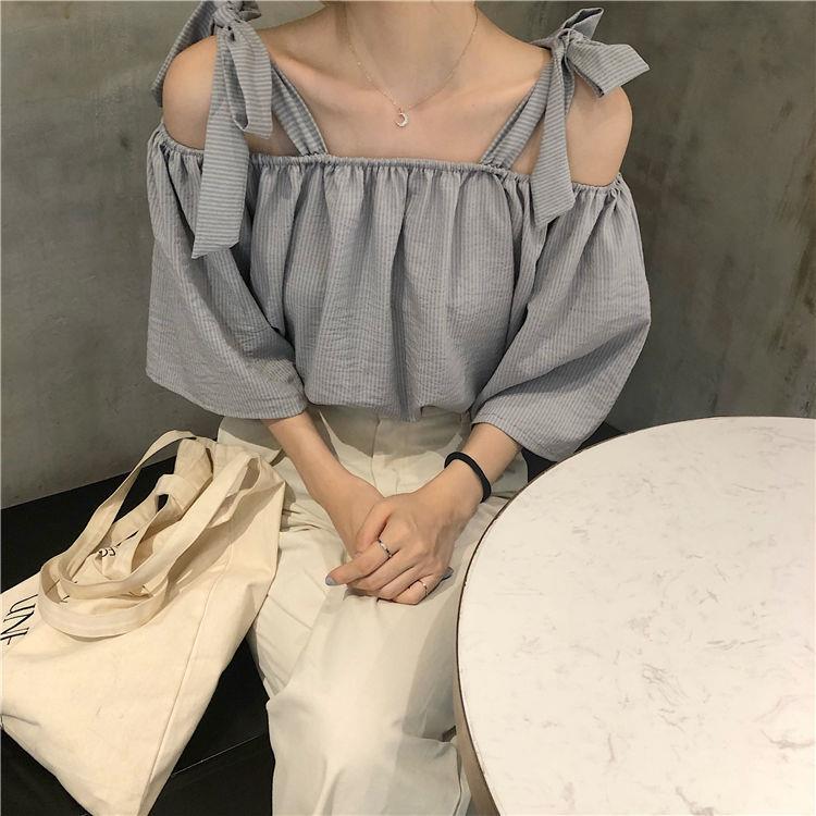 EDQRDQ Womens Summer Off Shoulder Blouse Striped Lace Up Top 3/4 Sleeve Casual Chiffon Tops Shirts