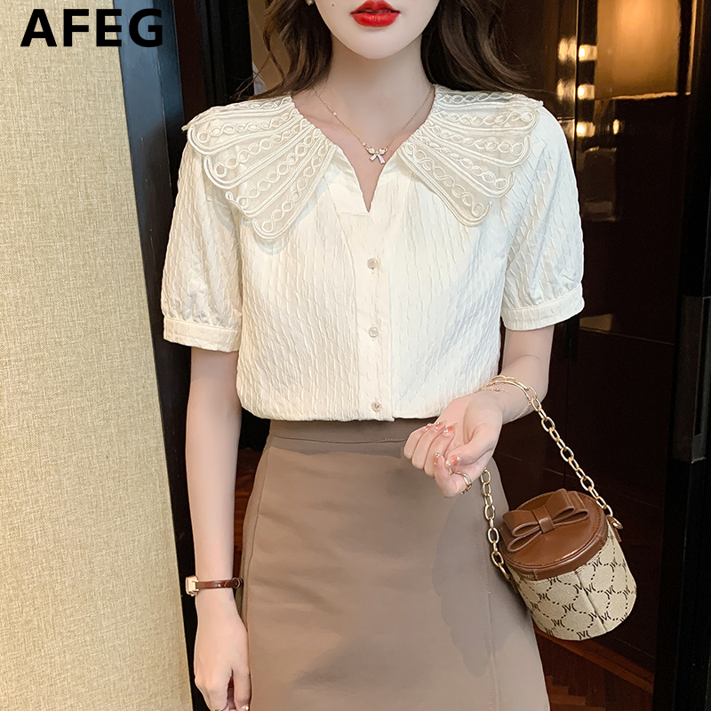AFEG new Korean style fashion loose all-match chiffon stitching lace short-sleeved blouse for women