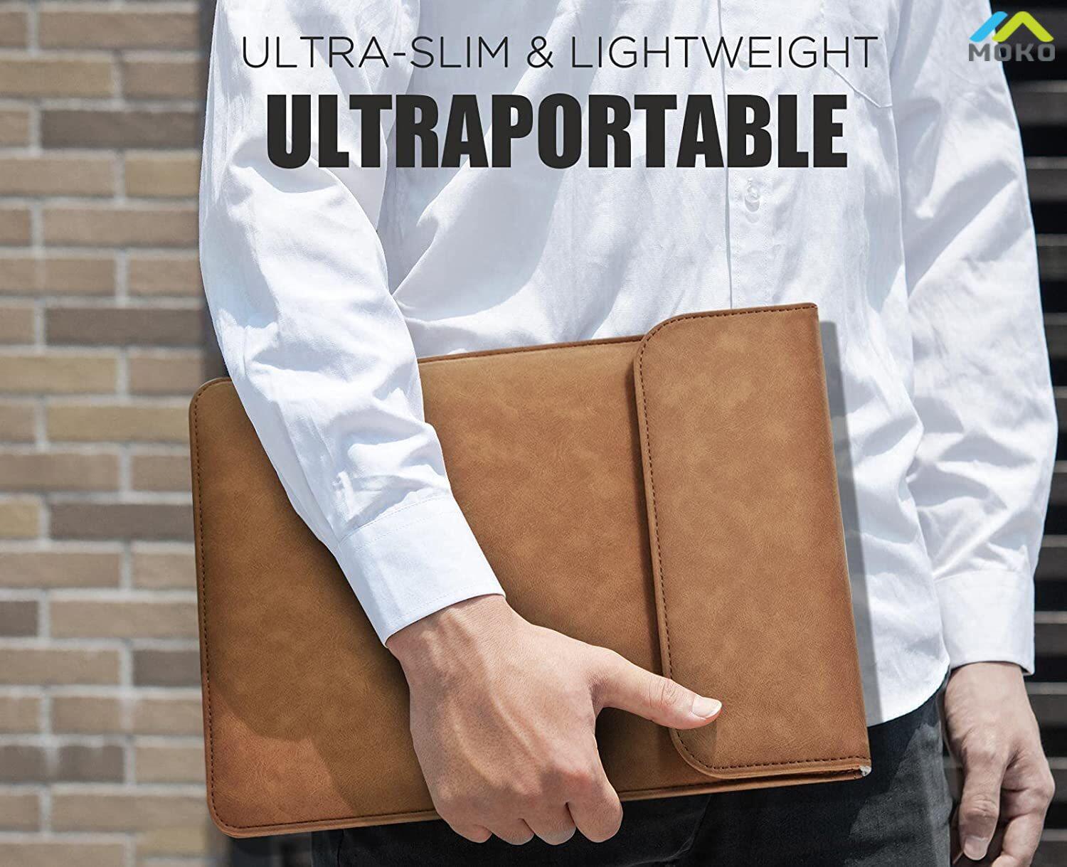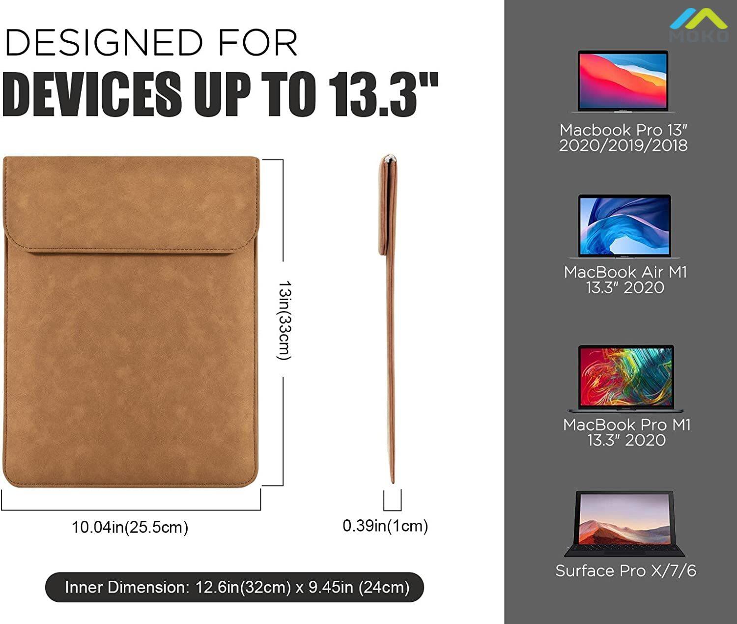 MoKo 13.3 inch laptop sleeve bag, stylish and elegant design, ideal for business and casual! The extra small bag satisfies your need to carry other items.COMPATIBILITYMacBook Pro 13 M1 2016-2021(A1706/A1708/A1989/A2159/A2251/A2289/A2338)MacBook Air 13 M1 2018-2021 (A1932/A2179/A2337)iPad Pro 12.9 M1 2021 2020 2018 (A1876/A2014/A1983/A1895/A2229/A2069/A2232/A2233/A2378/A2379/A2461/A2462)12.3 inch Surface Pro 7 Plus/7/6/5/4/313 inch Surface Pro X13.3 inch Dell XPS 13, 13.3 inch Galaxy Book S/Galaxy Book Flex/Galaxy Book Ion12.3 inch Pixelbook13.9 inch Huawei Matebook X ProTHE BEST CHOICE FOR YOU⭐It’s easy to slip into a backpack or briefcase without scratch and reduce the weight of your hands when you go outside.⭐Exclusive and trendy design, suitable for travel, business and leisure.⭐The soft interior protects your device from accidental damage, vibration and scratching.⭐It has a variety of uses. You may use the small bag as a makeup bag or storage bag.⭐Use the sleeve bag and small bag at the same time to keep your items organized.NEED ATTENTIONIt is recommended to use in the bare machine status.SUITABLE SIZE-Laptop sleeve bag-External dimension: 12.99*9.84* 0.59 inch (33*25*1.5cm)Internal dimension: 12.4*9.45 inch (31.5*24cm)-Small bag-The dimension of a small bag is 6.3*3.94*1.97 inch (16*10*5cm)There will be some deviation of the size which is measured manually. Please measure the dimension of your device before ordering.PACKAGE CONTENT1* Laptop sleeve bag1* Small bag