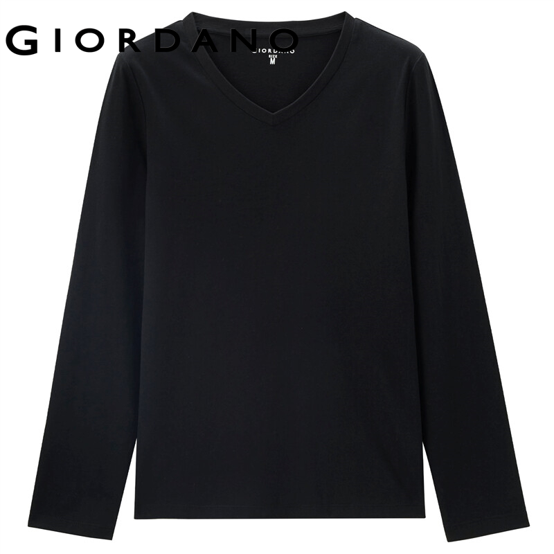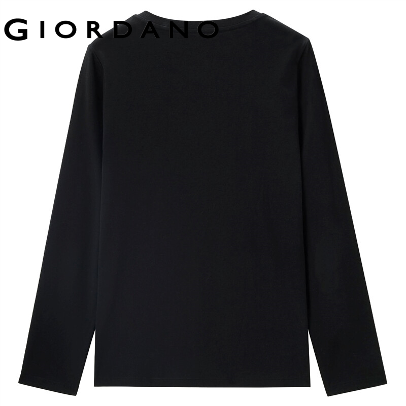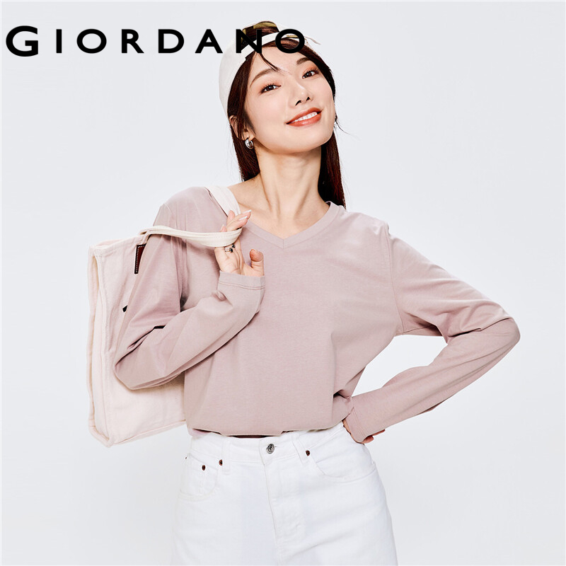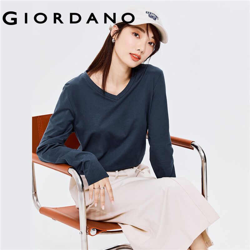 GIORDANO Women T-Shirts V-Neck Classic Plain Color Simple Basic T-Shirts Long Sleeve 100% Cotton Casual Comfy T-Shirts 13322759