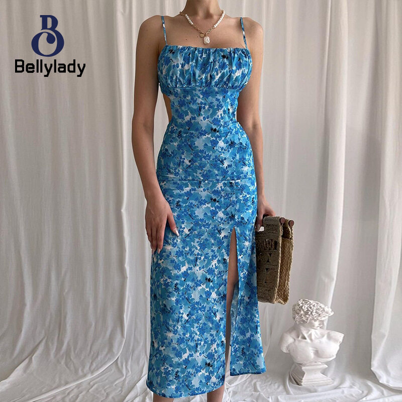 BellyLady Summer Women Floral Printing Sling Dress Sexy Backless Lace-up Sleeveless Pullover Long Skirt