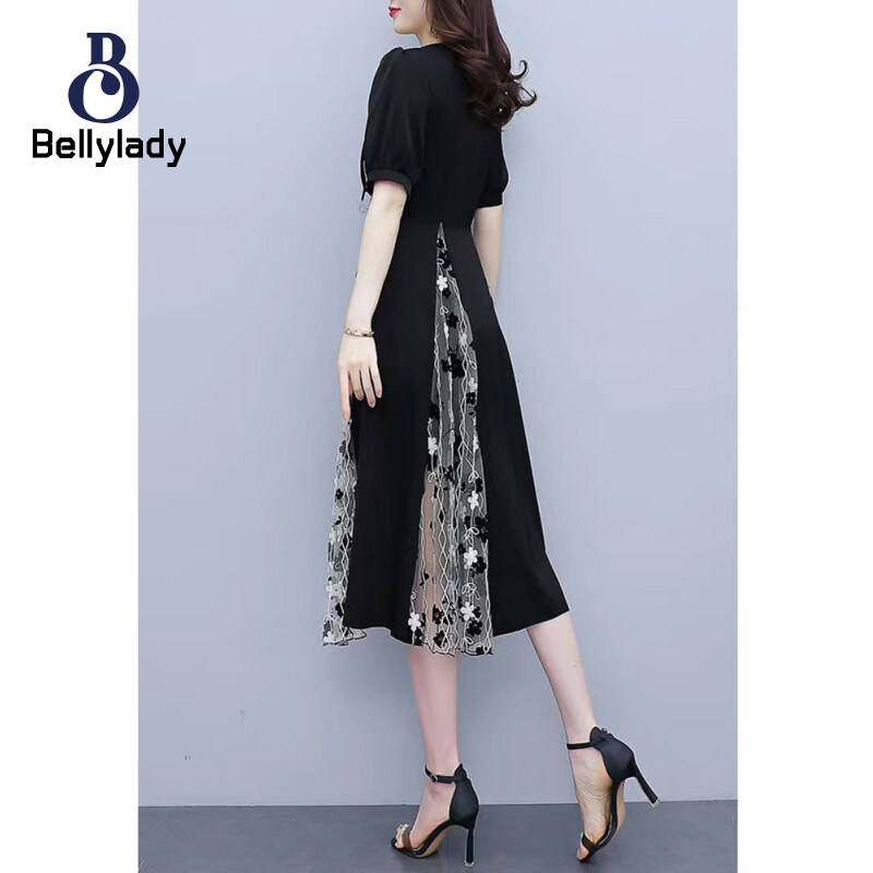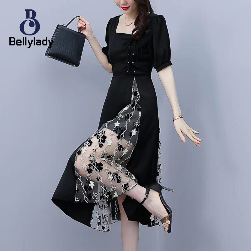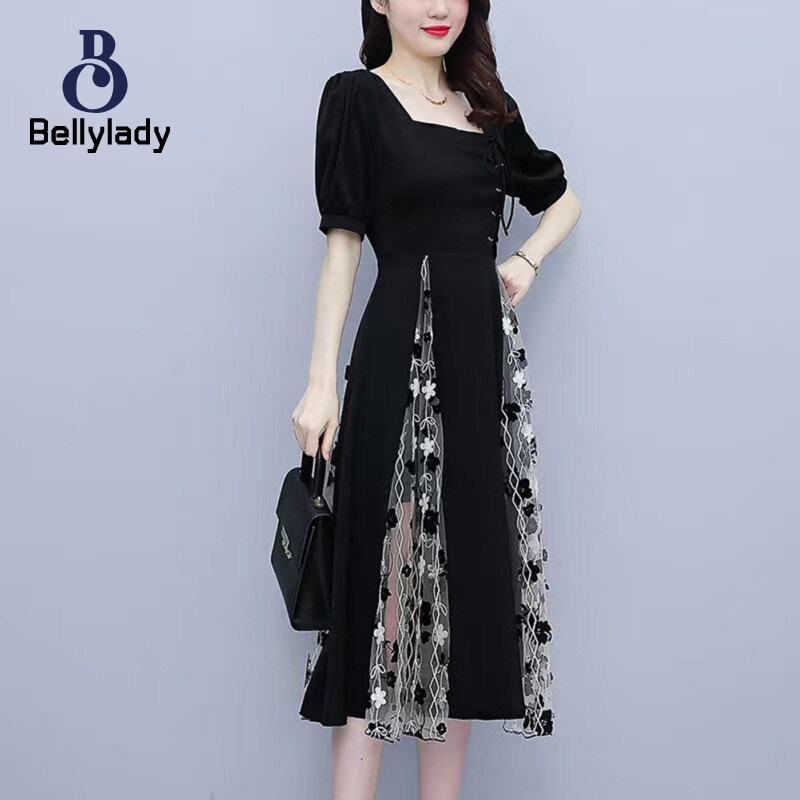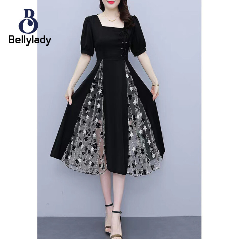 Women Square Collar Dress Large Size Lantern Sleeves Long Skirt Short Sleeves Mesh Dress