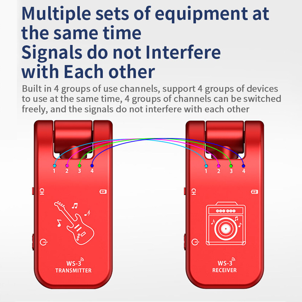 wireless audio system designed for electric musical instruments. The transmission frequency band is 800MHz-900MHz, the transmission range is 50m barrier-free and 30m through the wall. With ultra low delay, original sound quality transmission, strong anti-interference, 282-degree rotation 6.35mm audio interface, built-in rechargeable