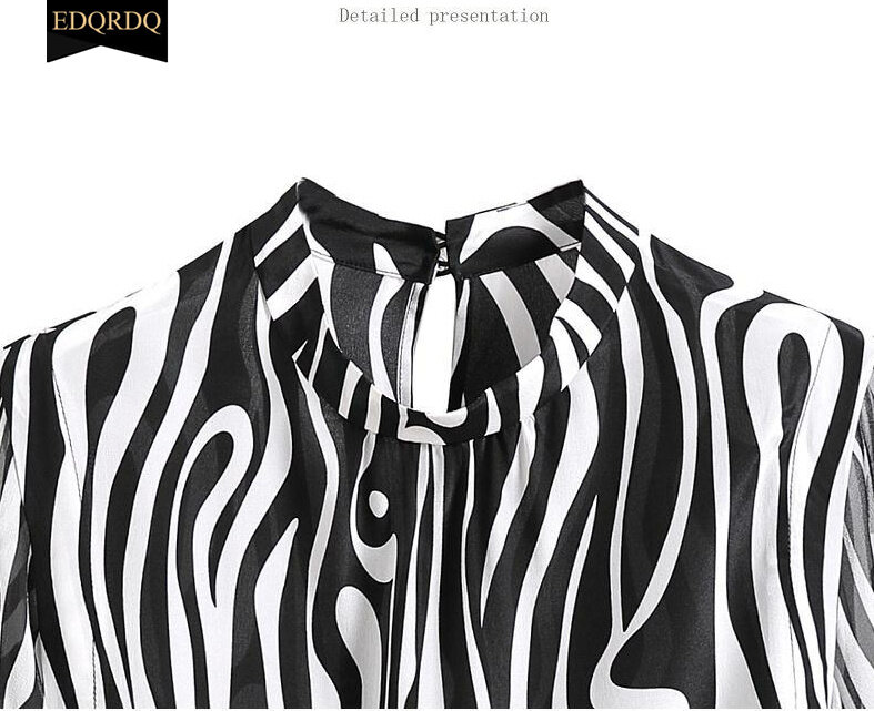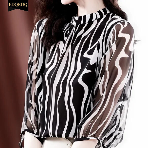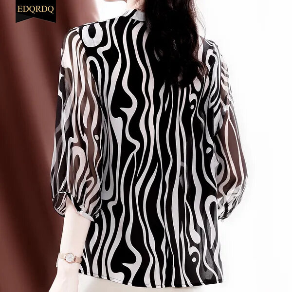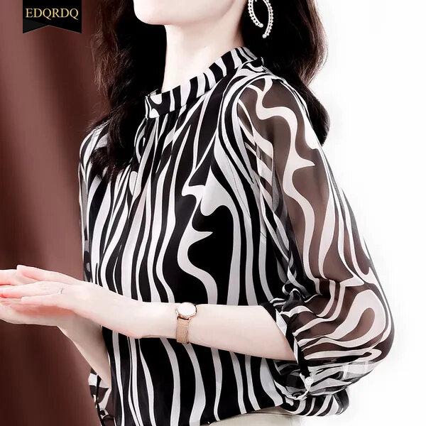EDQRDQ Womens Round Neck Striped 3/4 Sleeve Elegant Chiffon Blouses Top