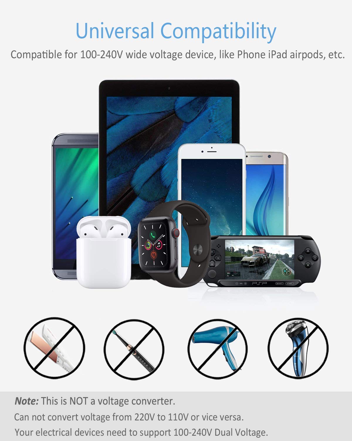 • Versatile Plug: This universal adapter can converts plug from US, EU, AU, UK to Type A plug, you can plug electronics from different countries (except India and South Africa) into the power outlet in USA. (Note: This is not a voltage converter, only compatible for 100V to 250V wide voltage device)