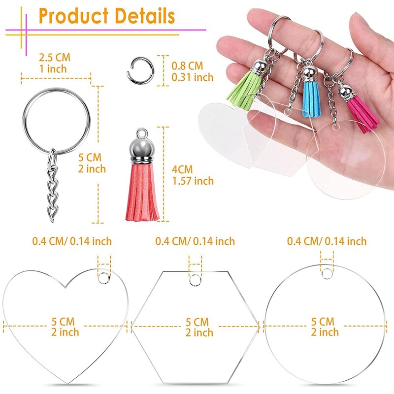 120 PCS Acrylic Keychains Blanks Bulk: Sufficient quantity and different shape, you can share with your family and friends for DIY Craft home Ornament.The tassels are super cute and the acrylic is crystal clear!