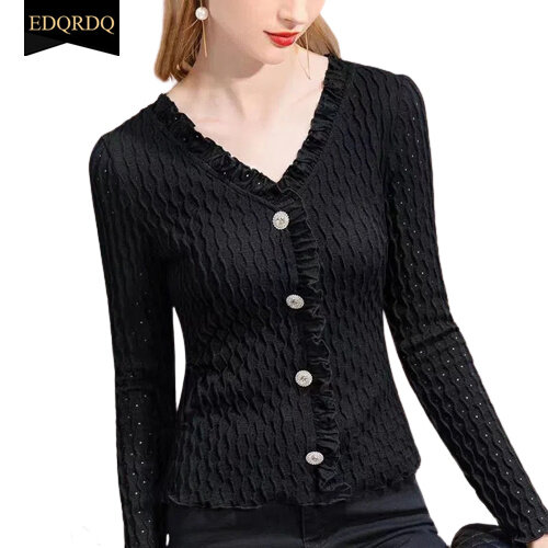 EDQRDQ Elegant Chiffon Tops Falbala Ruffles V Neck Button Blouses for Women