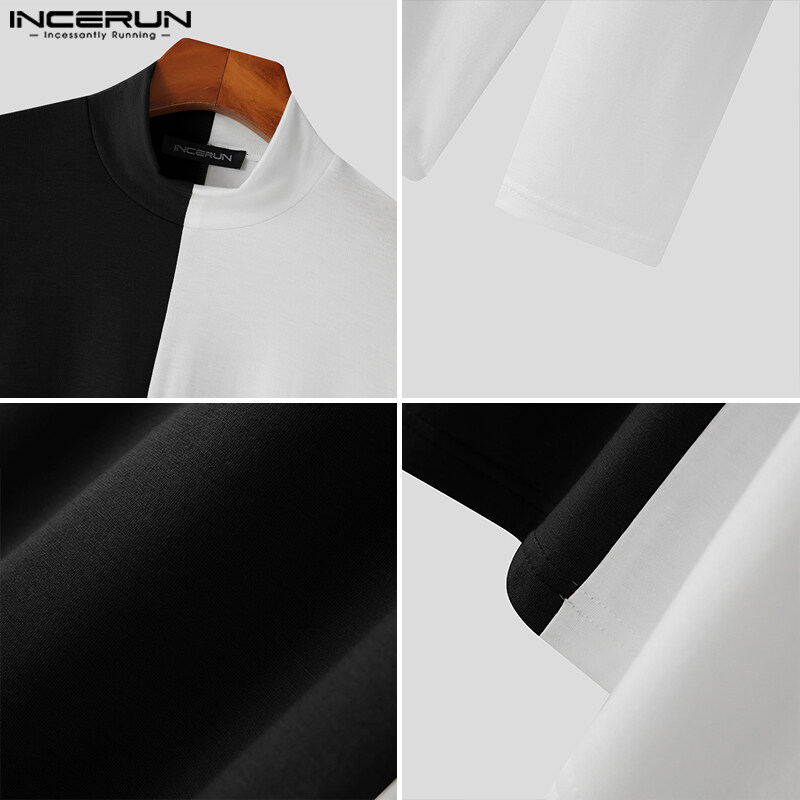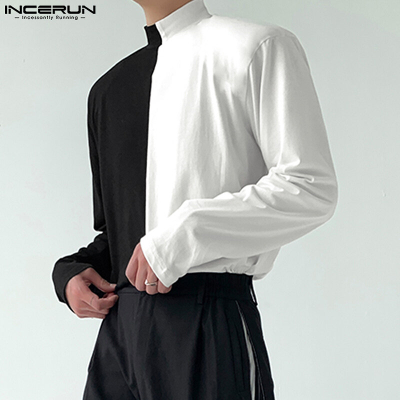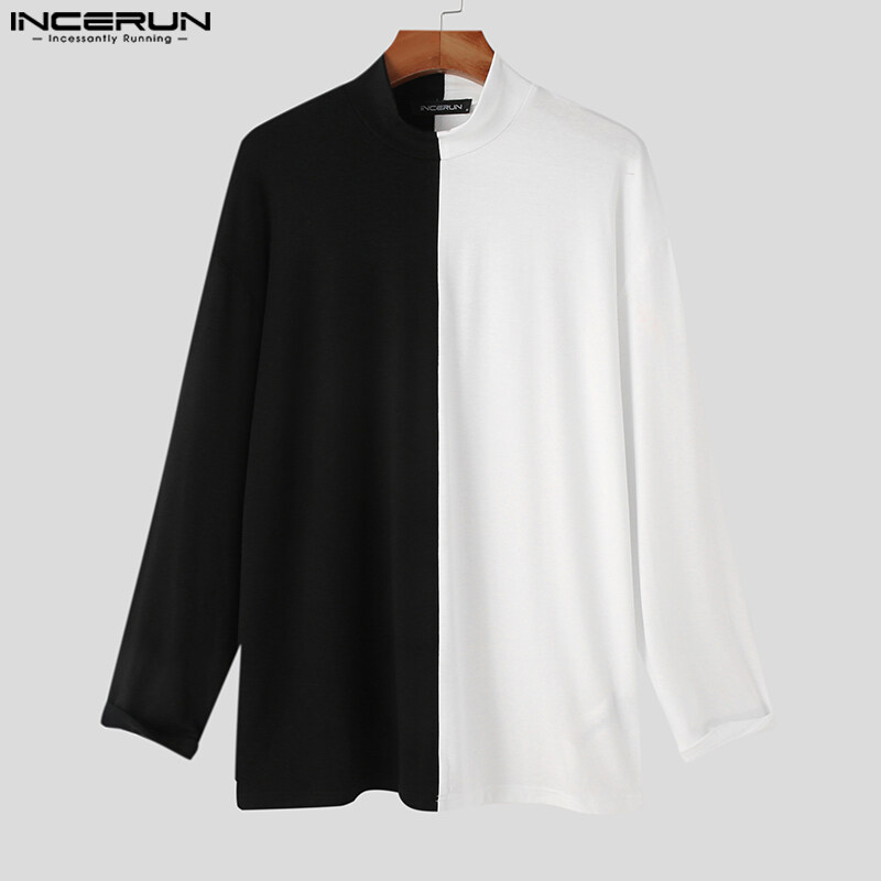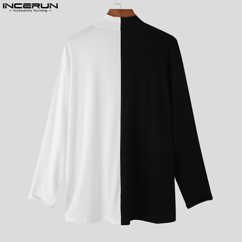 INCERUN Mens Long Sleeve Black&White Patchwork T Shirts Casual Fit Blouse (Korean Style)