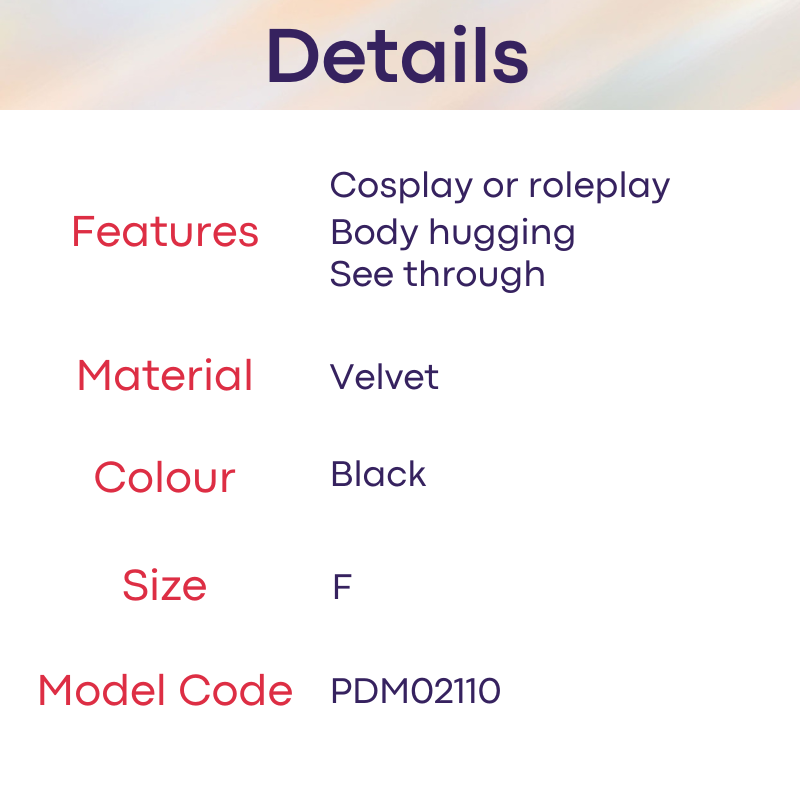 Made of velvet. Body hugging + see through gets you right for the roleplay, lots of mystery and excitement. Off shoulder dress stocking shows off your slender shoulders.
