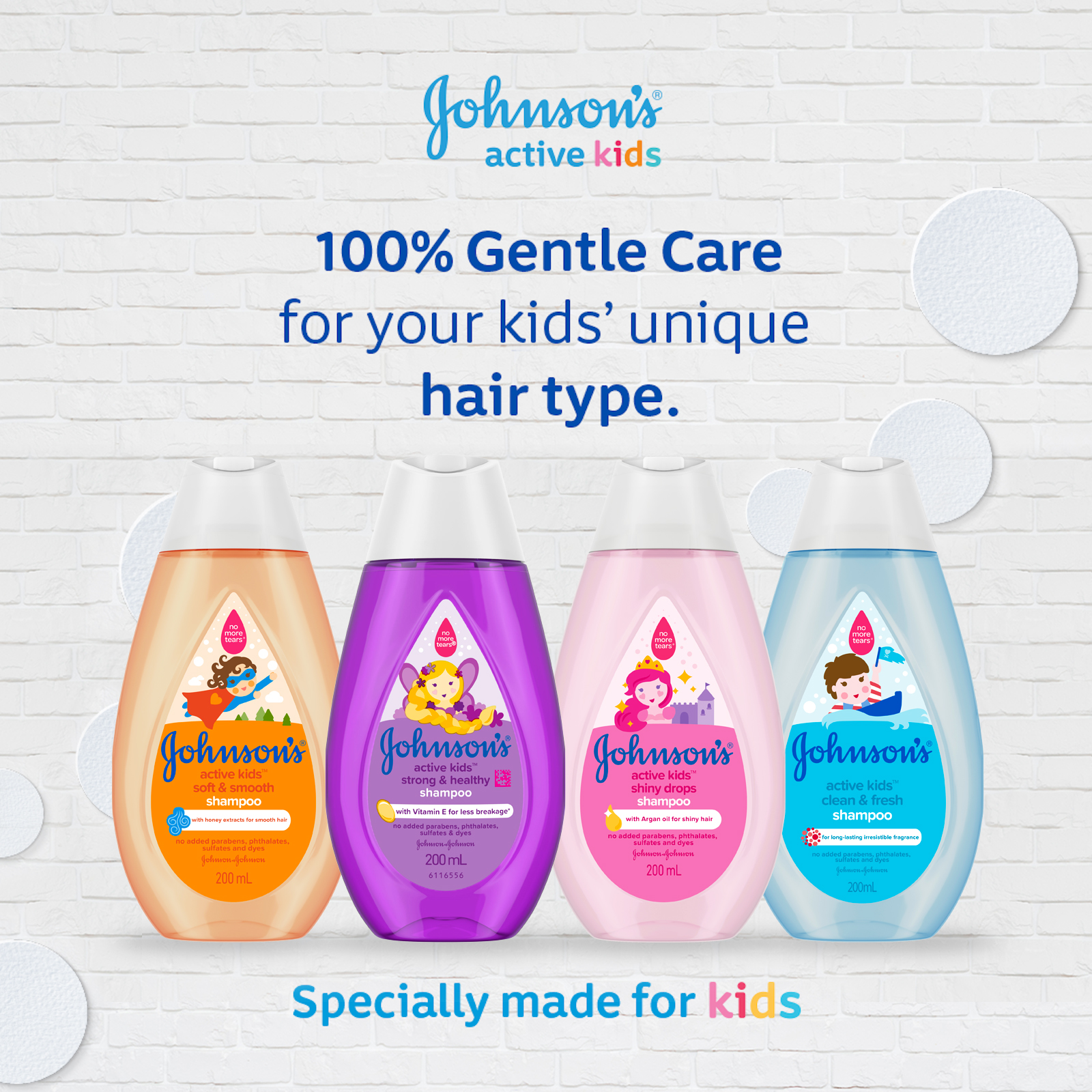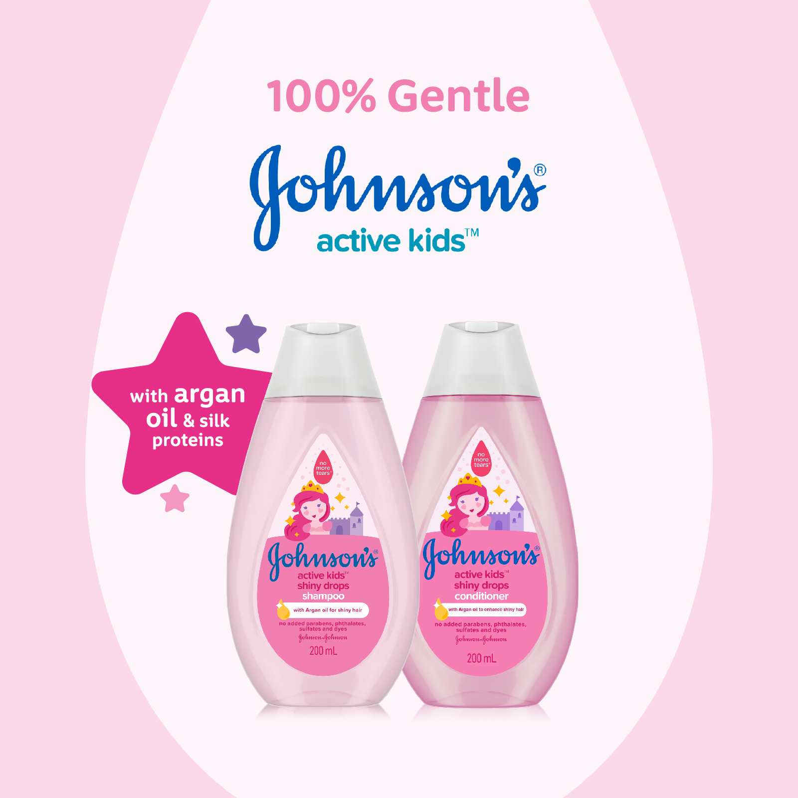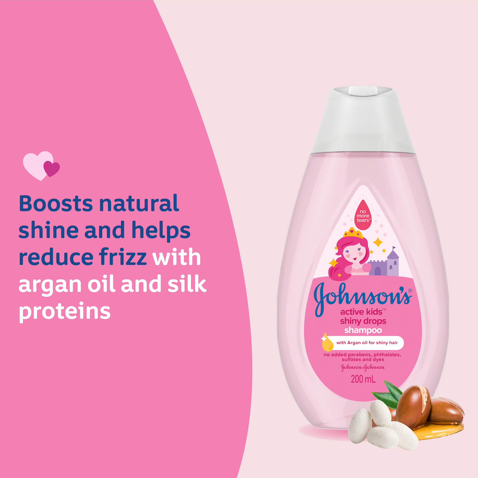 Johnson's® Active Kids™ Shiny Drops Shampoo gently cleanses with Argan oil & silk proteins for shiny & silky hair. As baby starts to walk & play, their needs change. Our Active Kids™ range is specially designed to be gentle versus adult products, but effective for toddler needs.