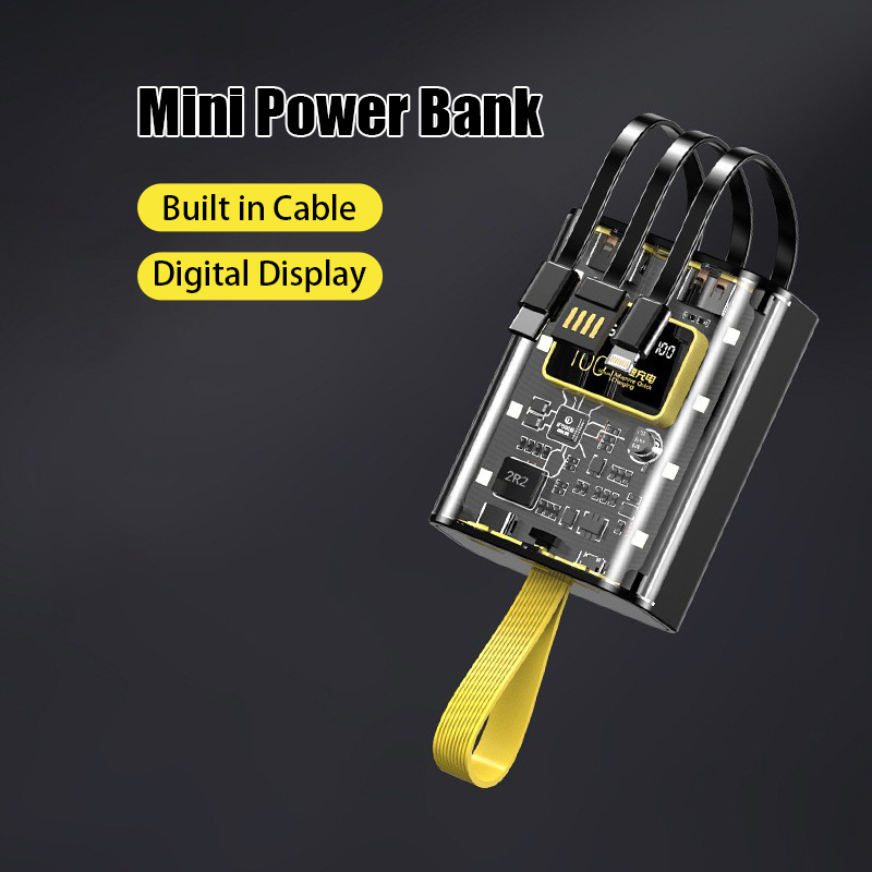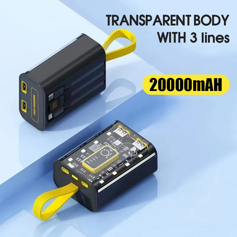 ?SG Ready Stock?20000mah Powerbank Built-in 3 Cables Transparent Cover Fast Charge Power Bank Dual USB Full Capacity Mini Power Bank Mini Power Bank