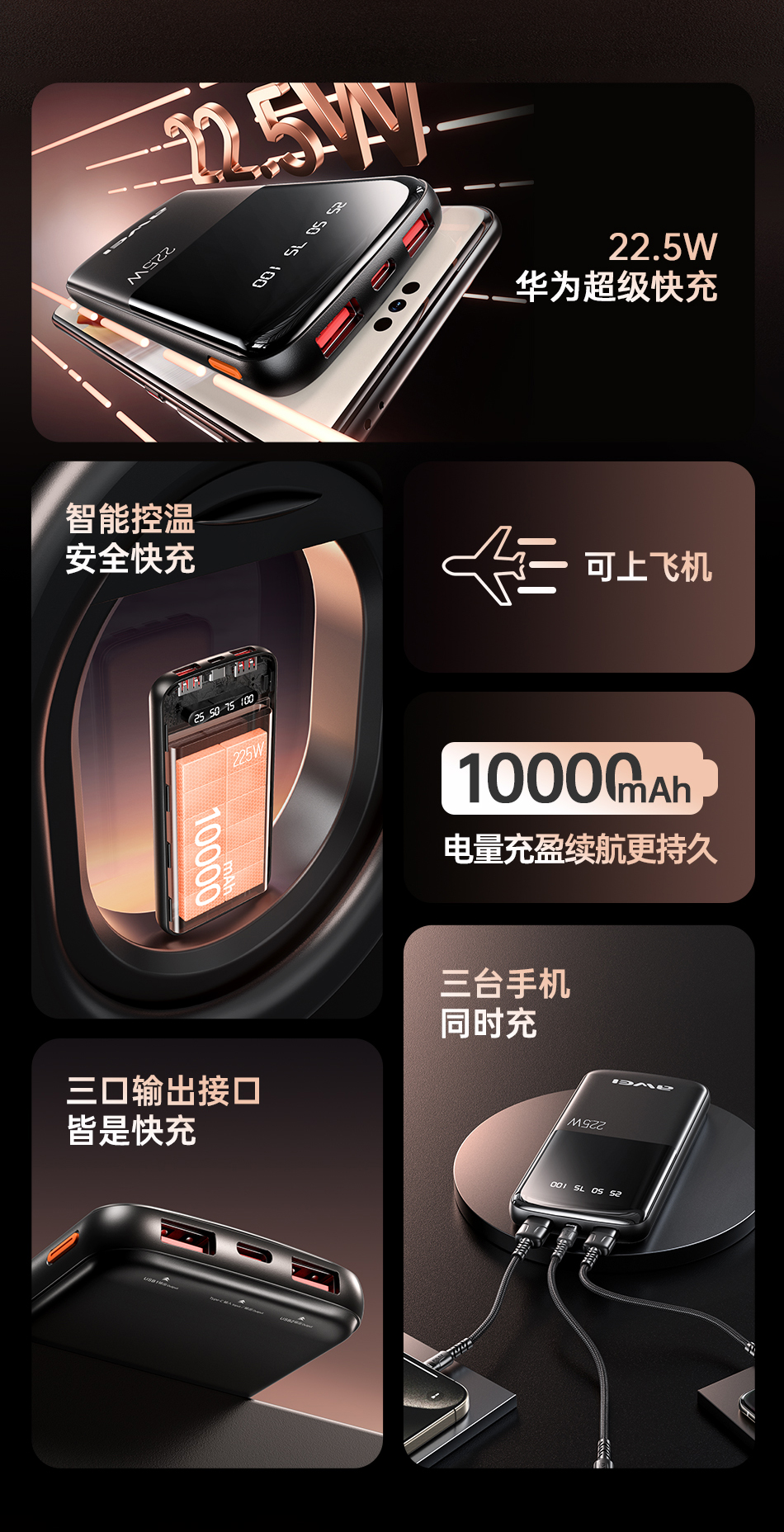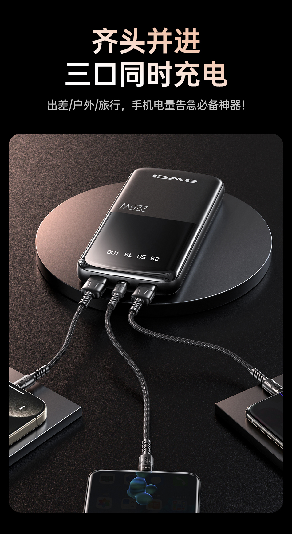 Awei P10K 10000mAh PD 22.5W Power bank fast charging 3 ports power banks LED Digital display powerbank for iPhone Samsung Pixel iPad
