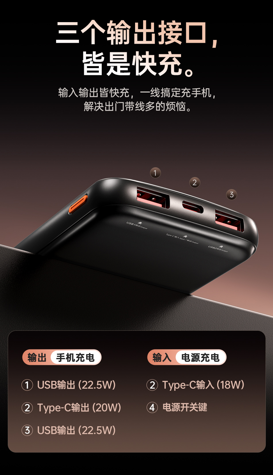 Type-A2 port outputs: 10V/2.25A, 5V/3A, 9V/2A, 12V/1.5A