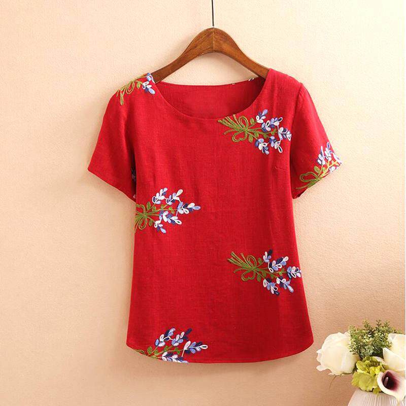 Cotton summer middle-aged women's national wind embroidery flower short-sleeved shirt