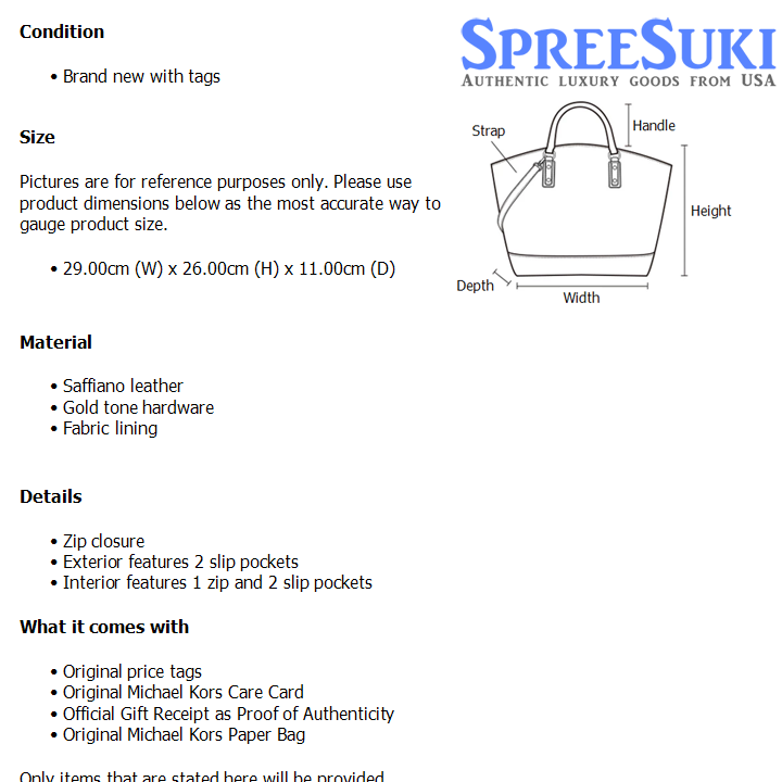 Original price tagsOriginal Michael Kors Care CardOfficial Gift Receipt as Proof of AuthenticityOriginal Michael Kors Paper Bag