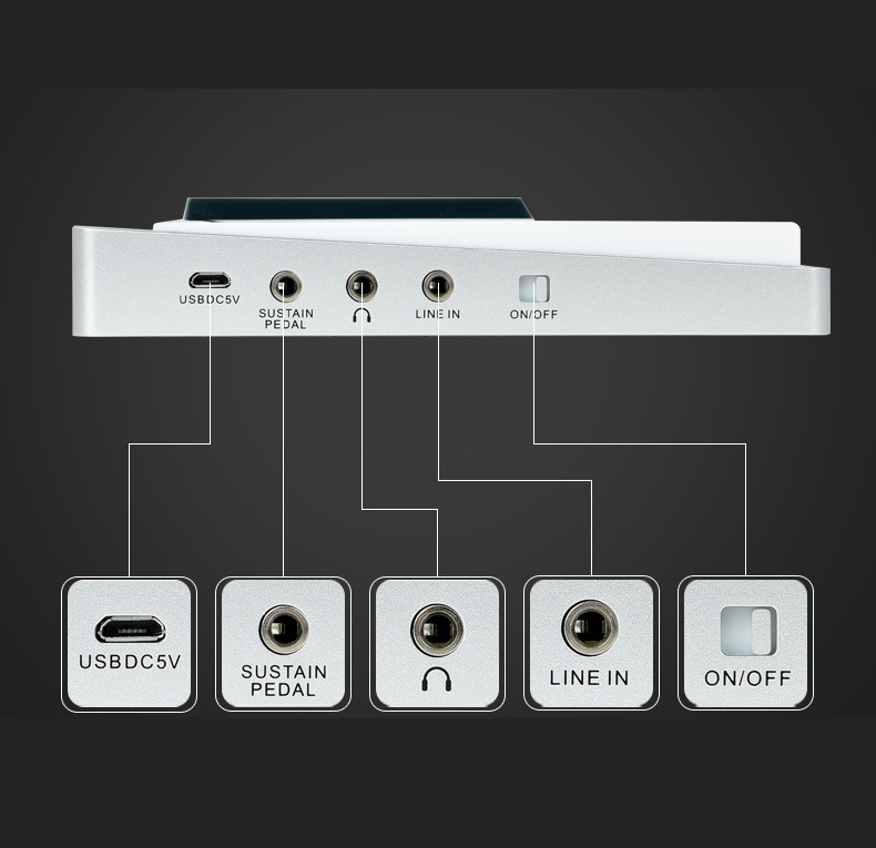 Note: adapter is not included, because it's easy to damage when in transit and will made a scratch on the piano. can be use the USB cable and with a phone's adapter to charge.