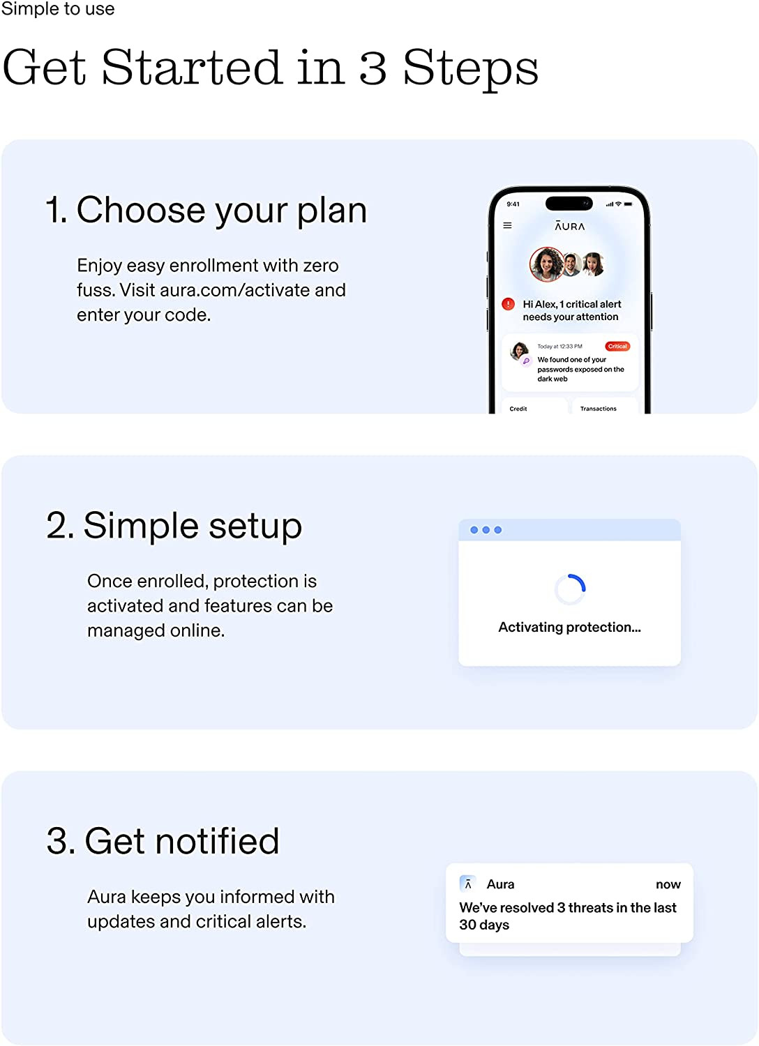 • PEACE OF MIND: Aura plans include $1 million identity theft insurance protection and 24/7 support from our white glove fraud resolution team.